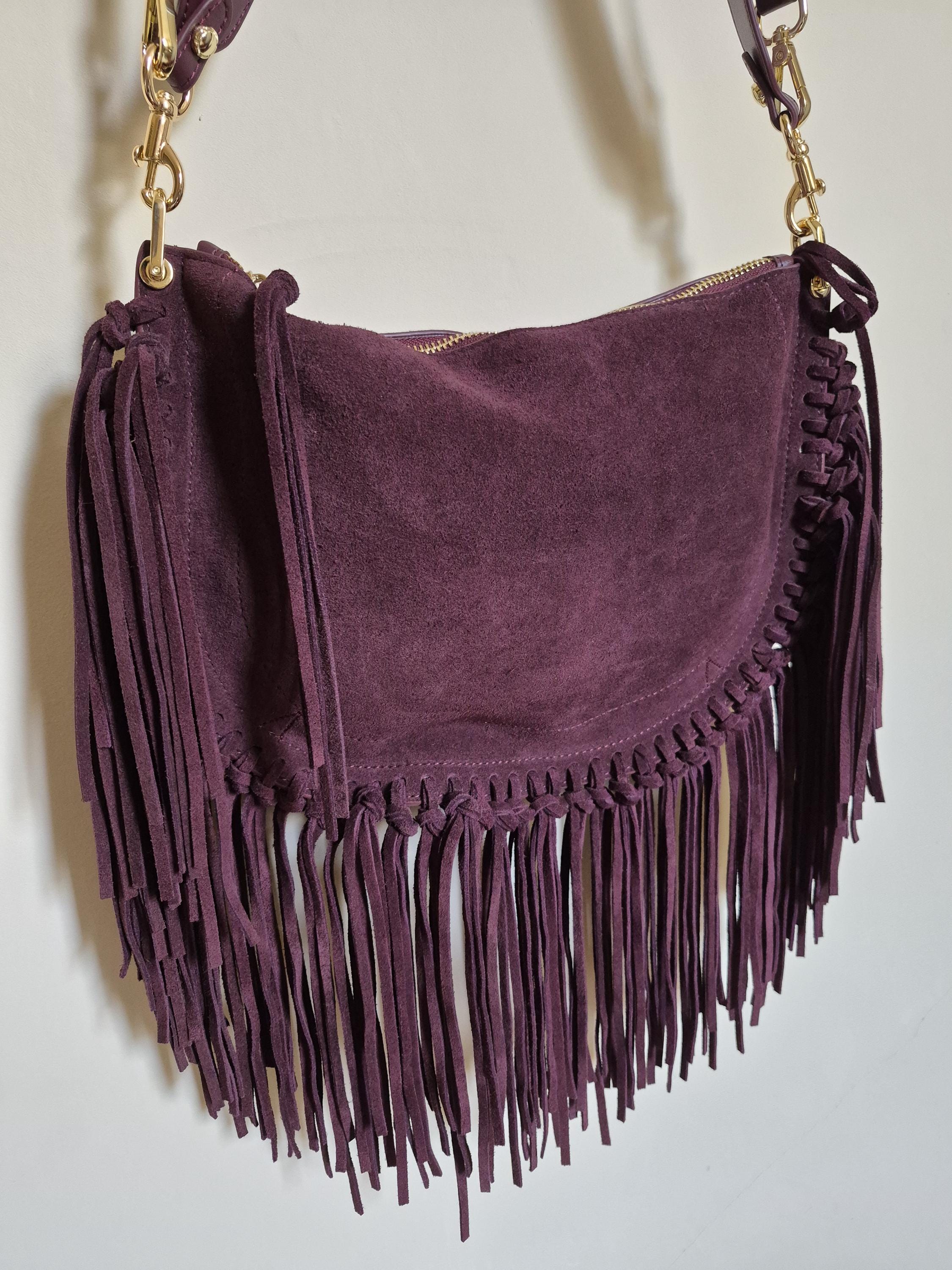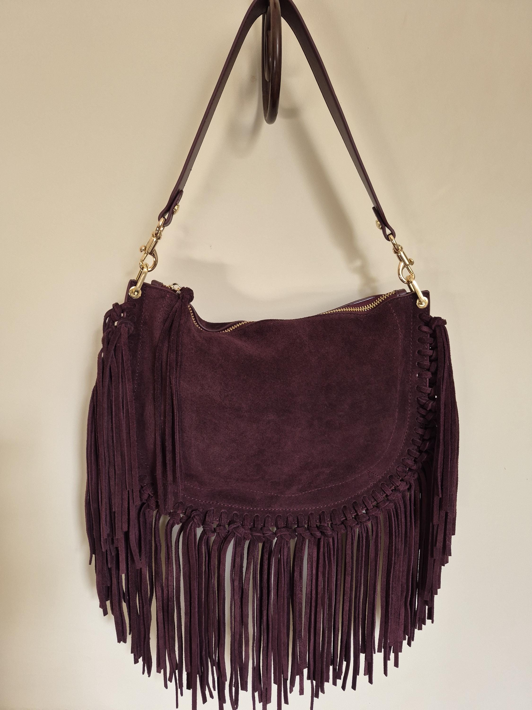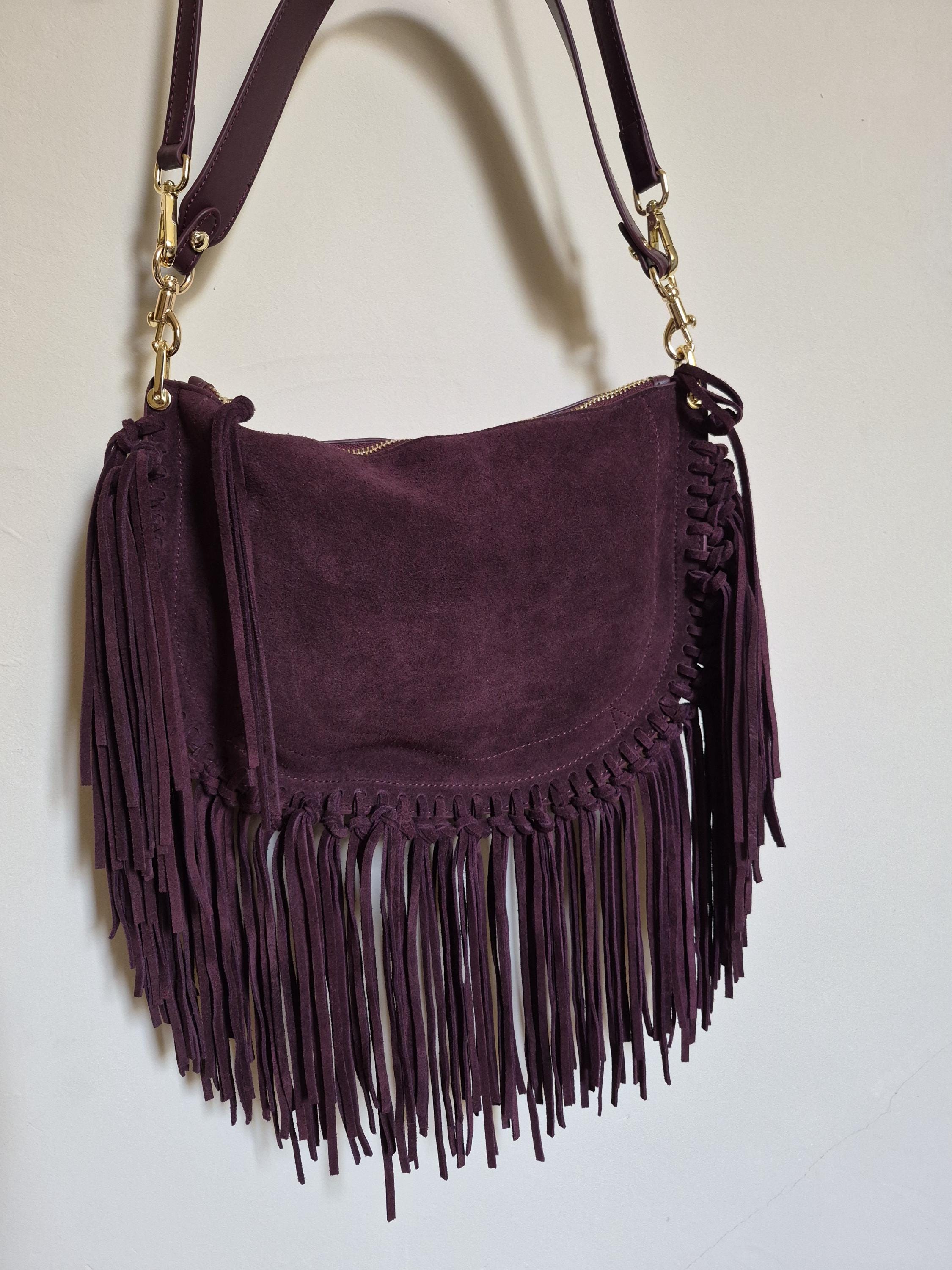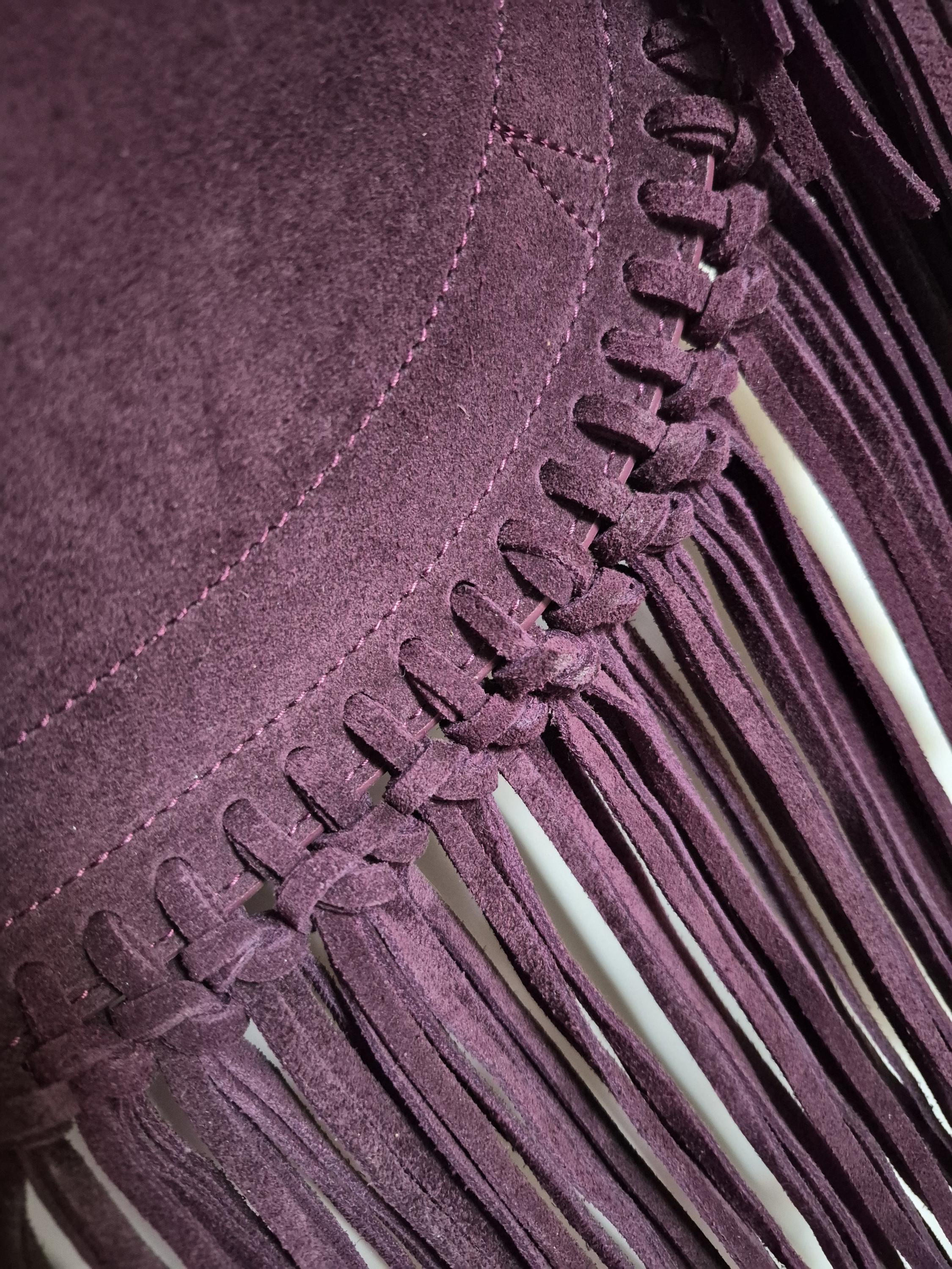 Succumb to the timeless charm of this fringed bag in genuine suede leather, in a deep plum tone that combines elegance and originality.