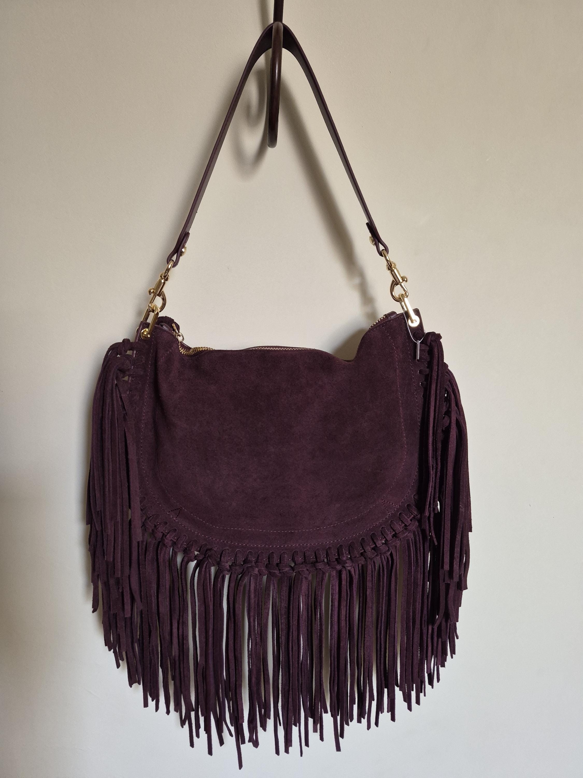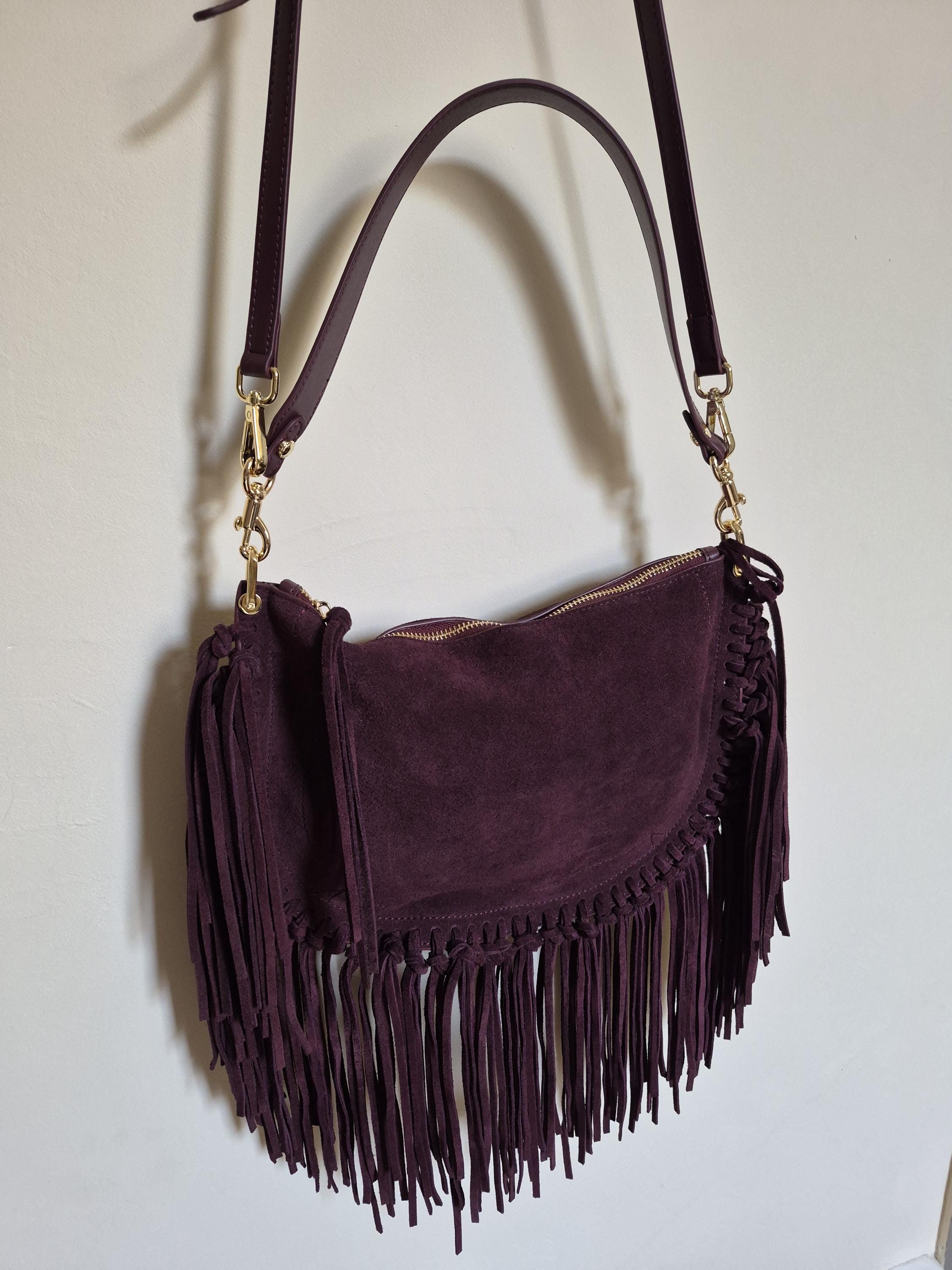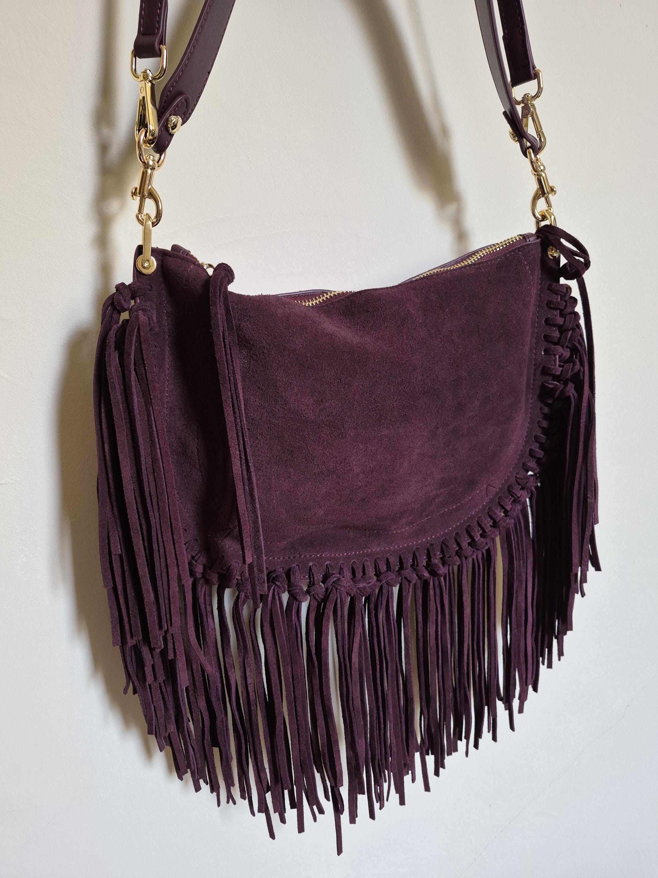 Succumb to the timeless charm of this fringed bag in genuine suede leather, in a deep plum tone that combines elegance and originality.