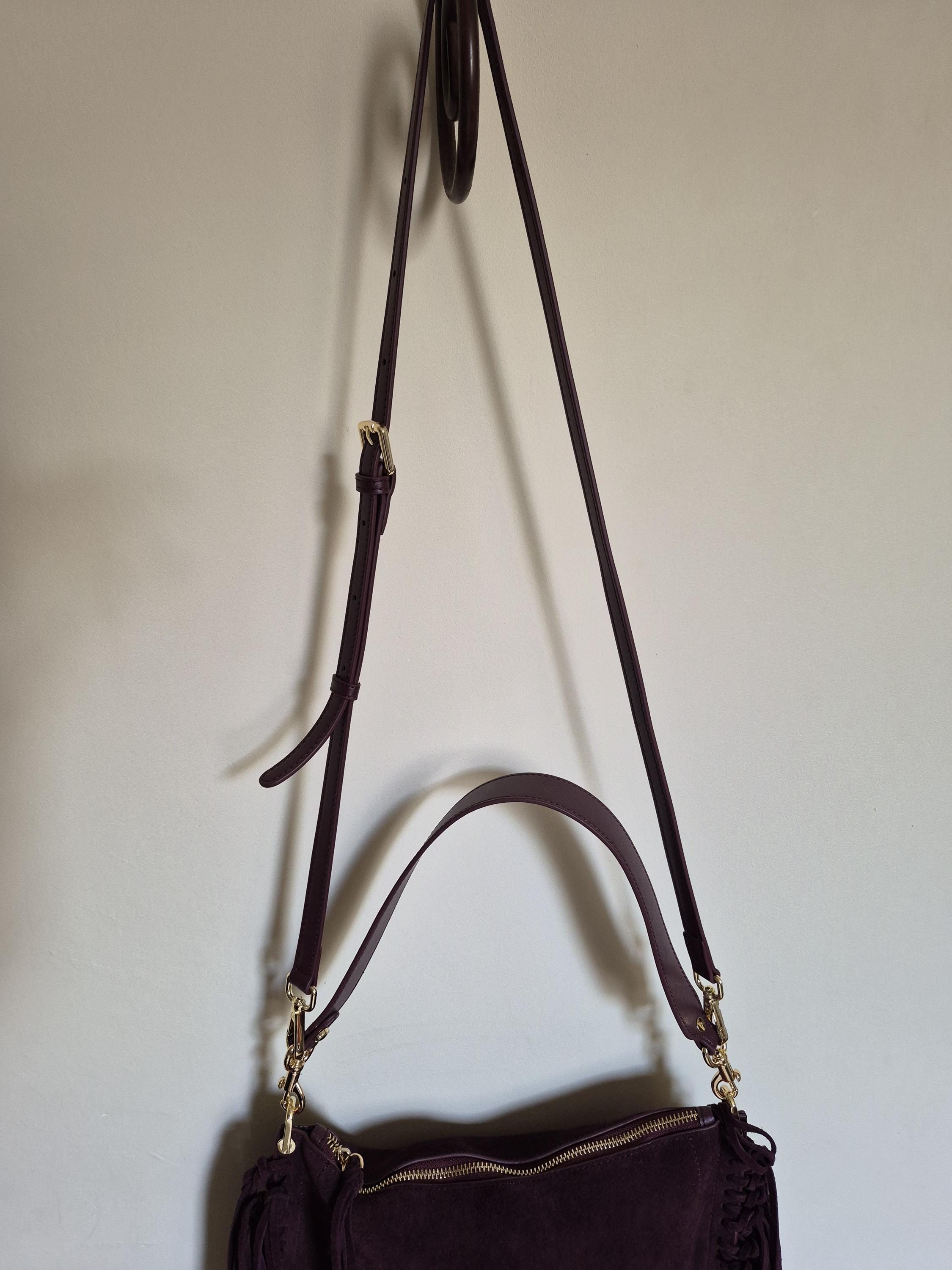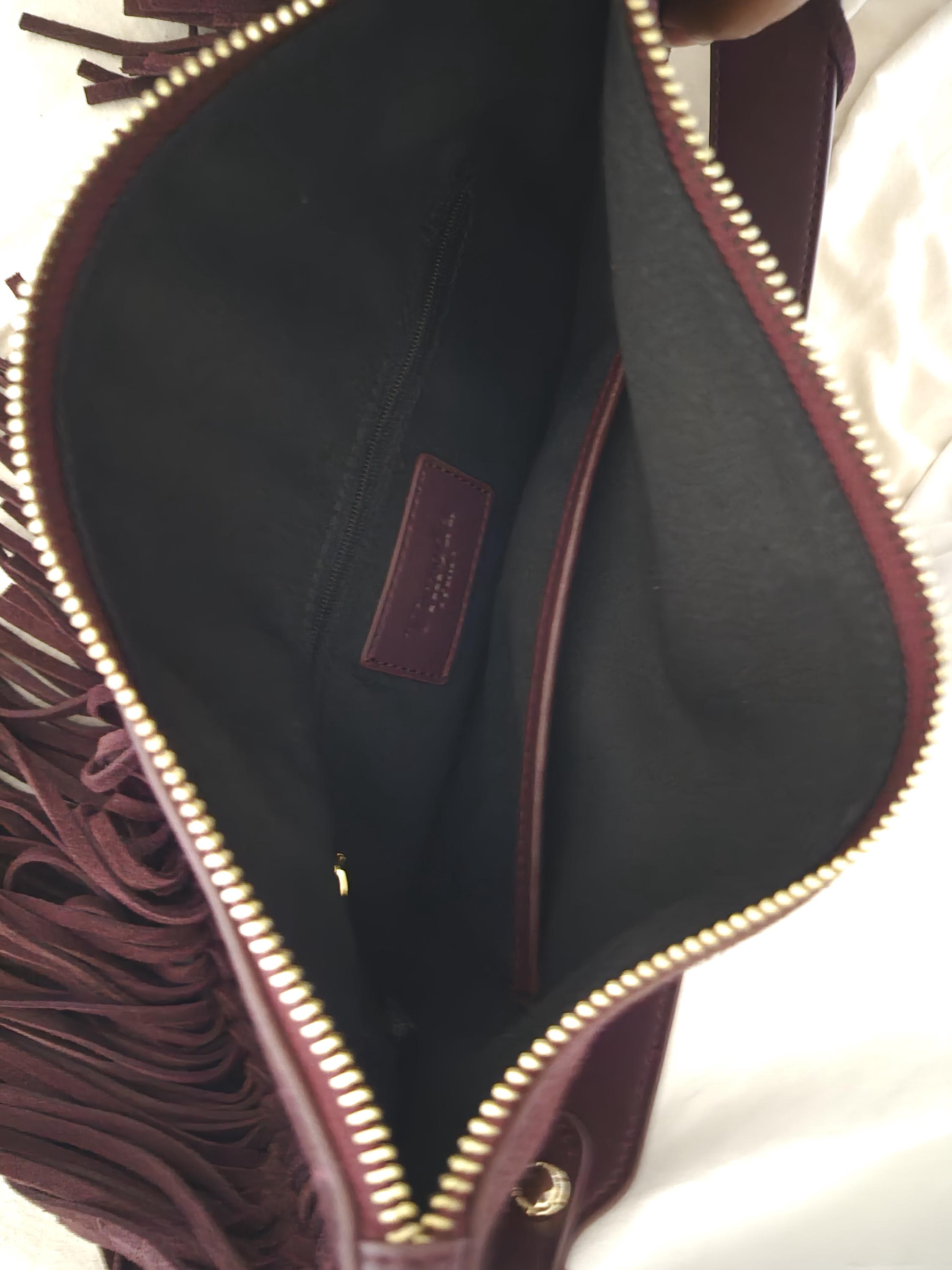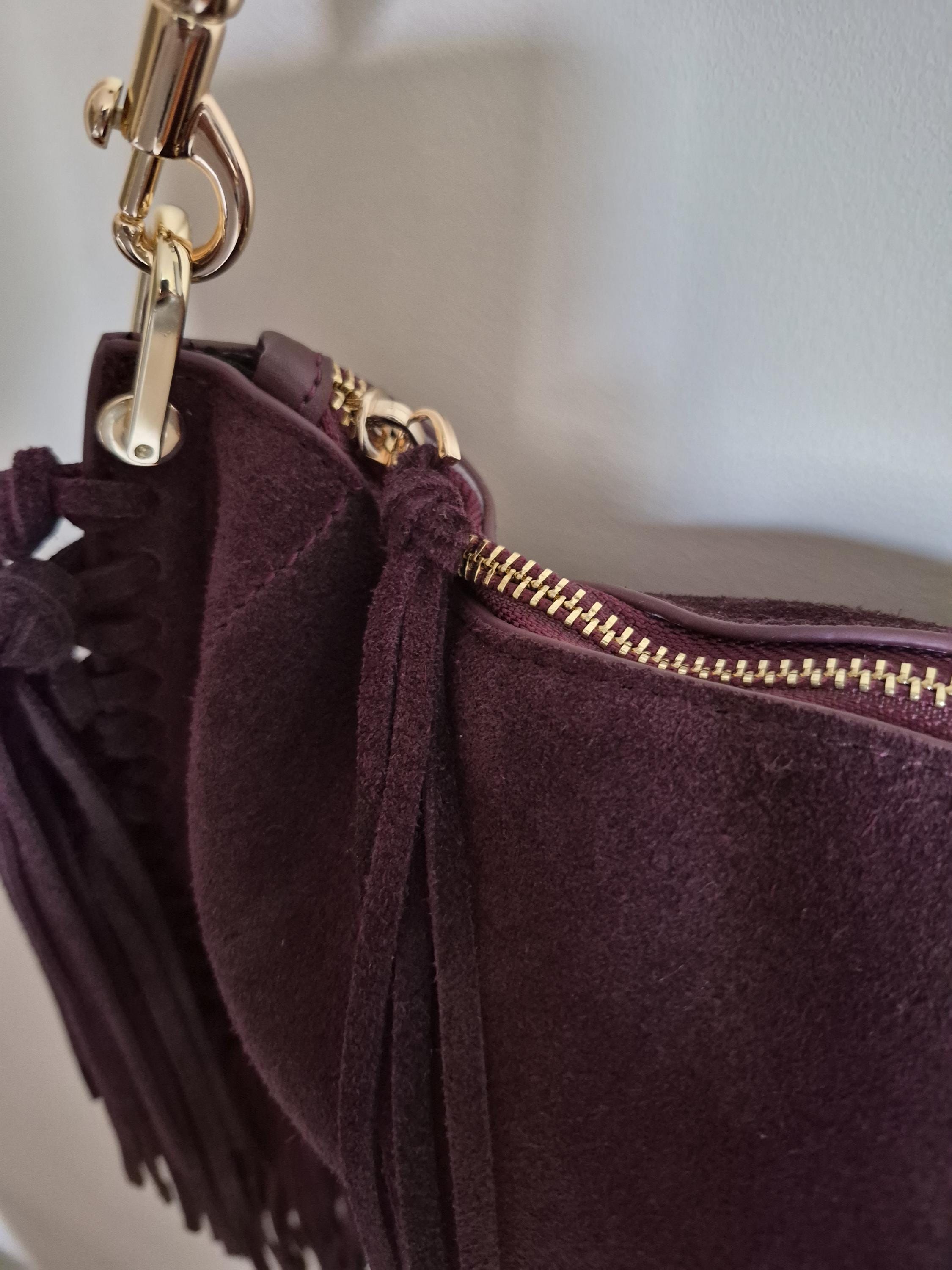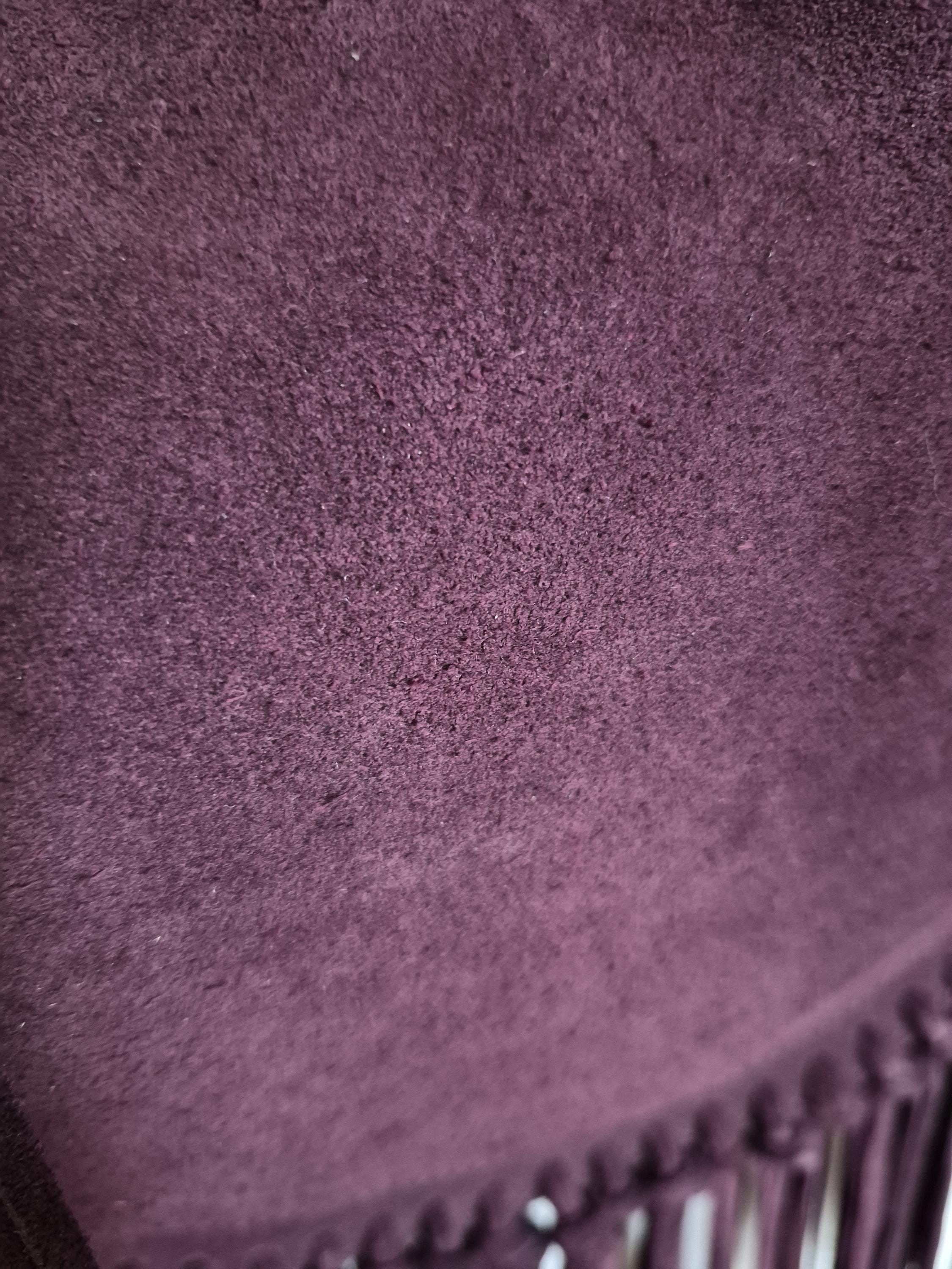 Succumb to the timeless charm of this fringed bag in genuine suede leather, in a deep plum tone that combines elegance and originality.