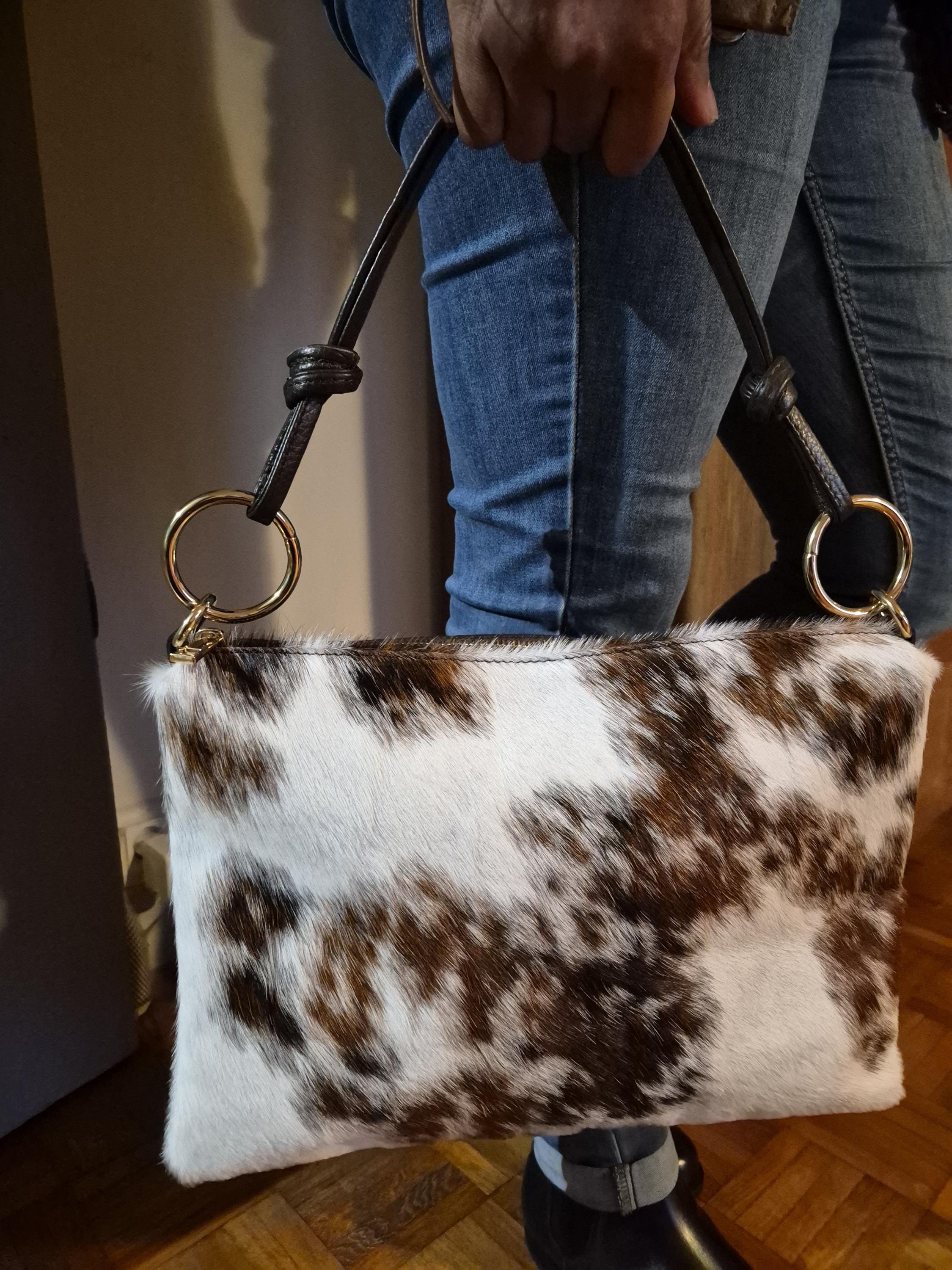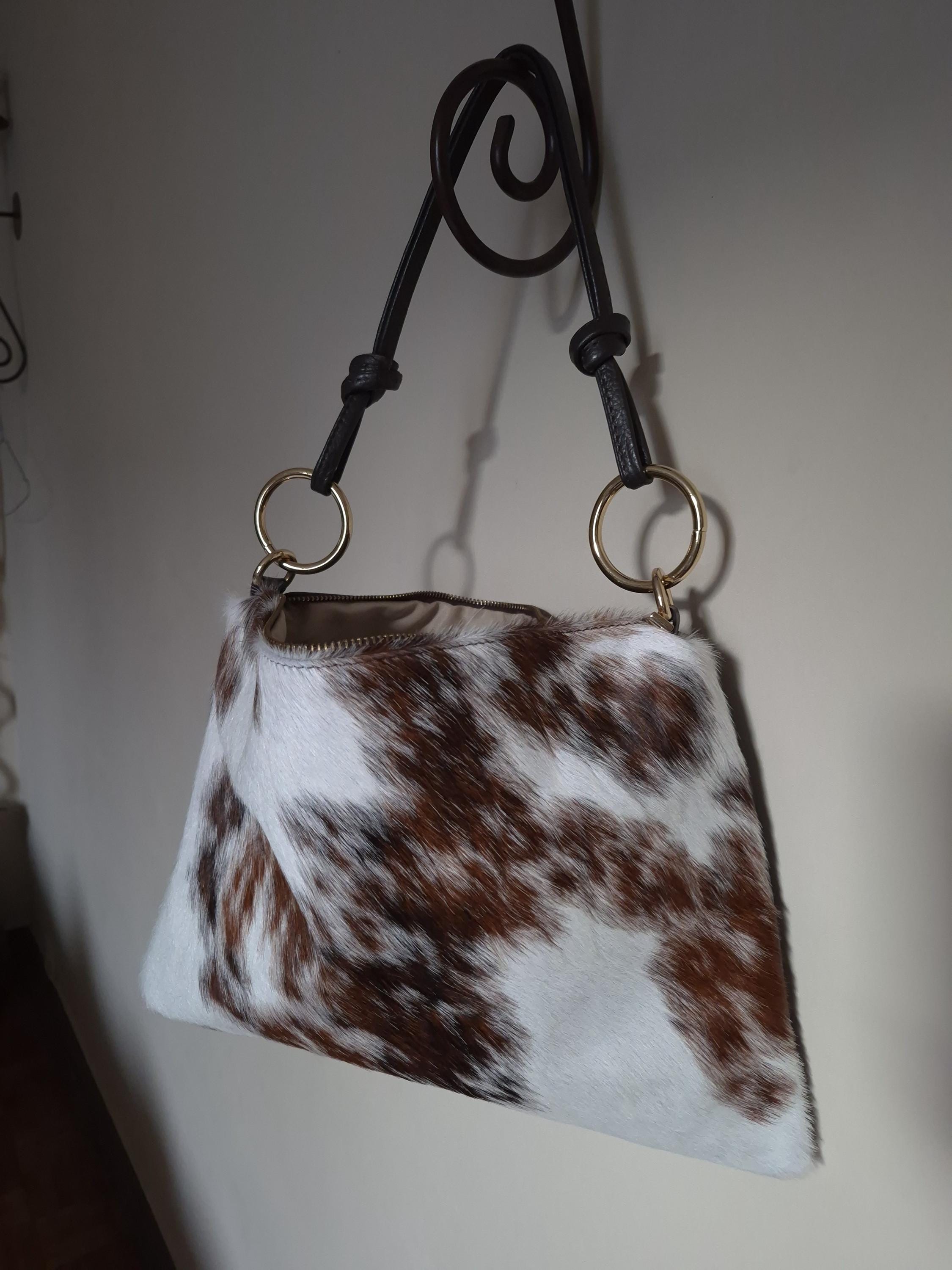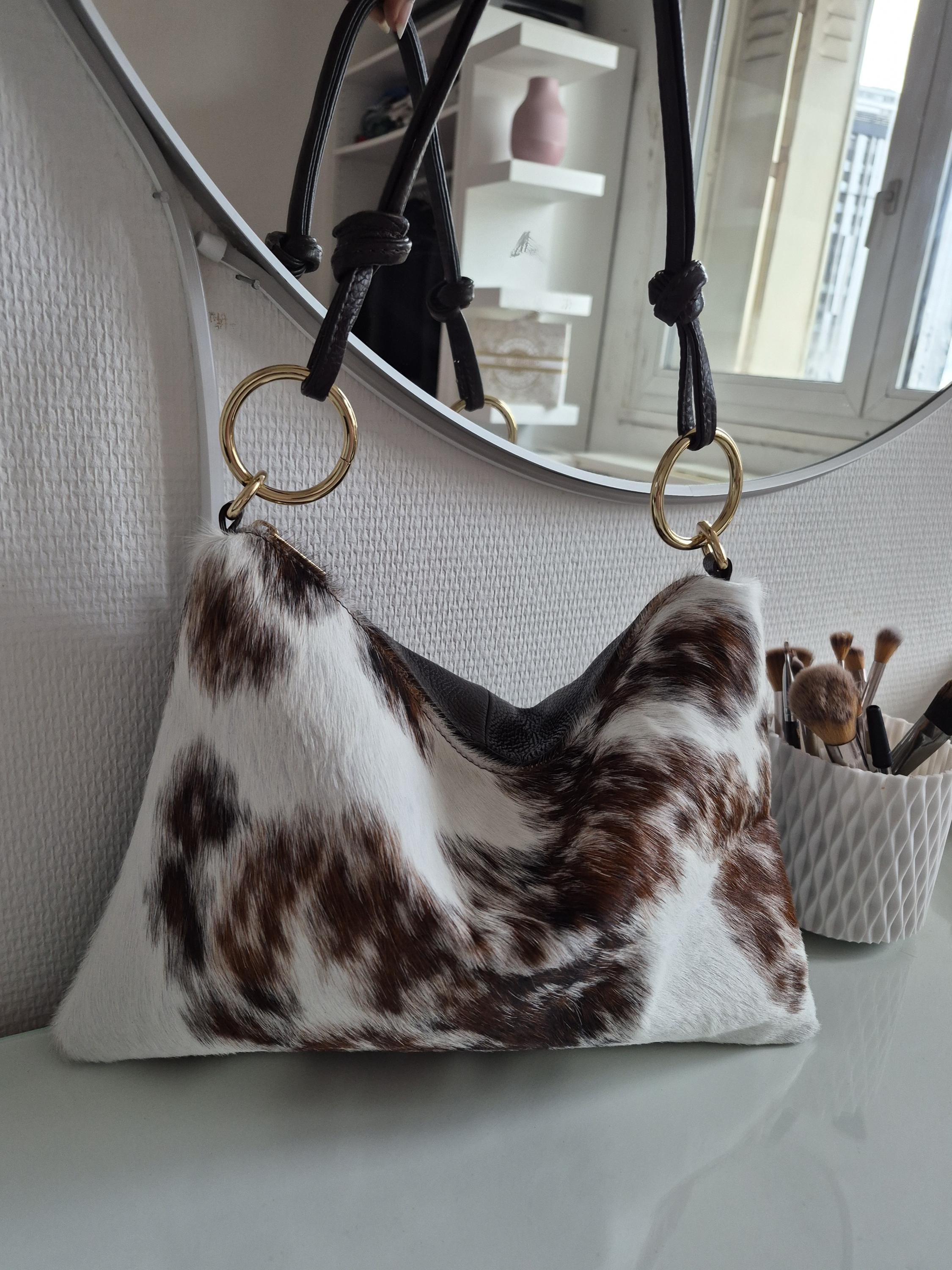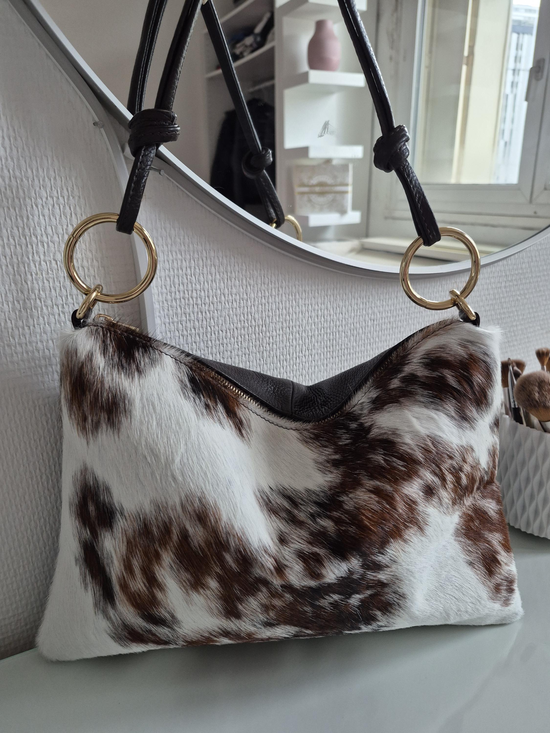 This magnificent cowhide print handbag is a unique piece that combines rustic elegance and modernity.