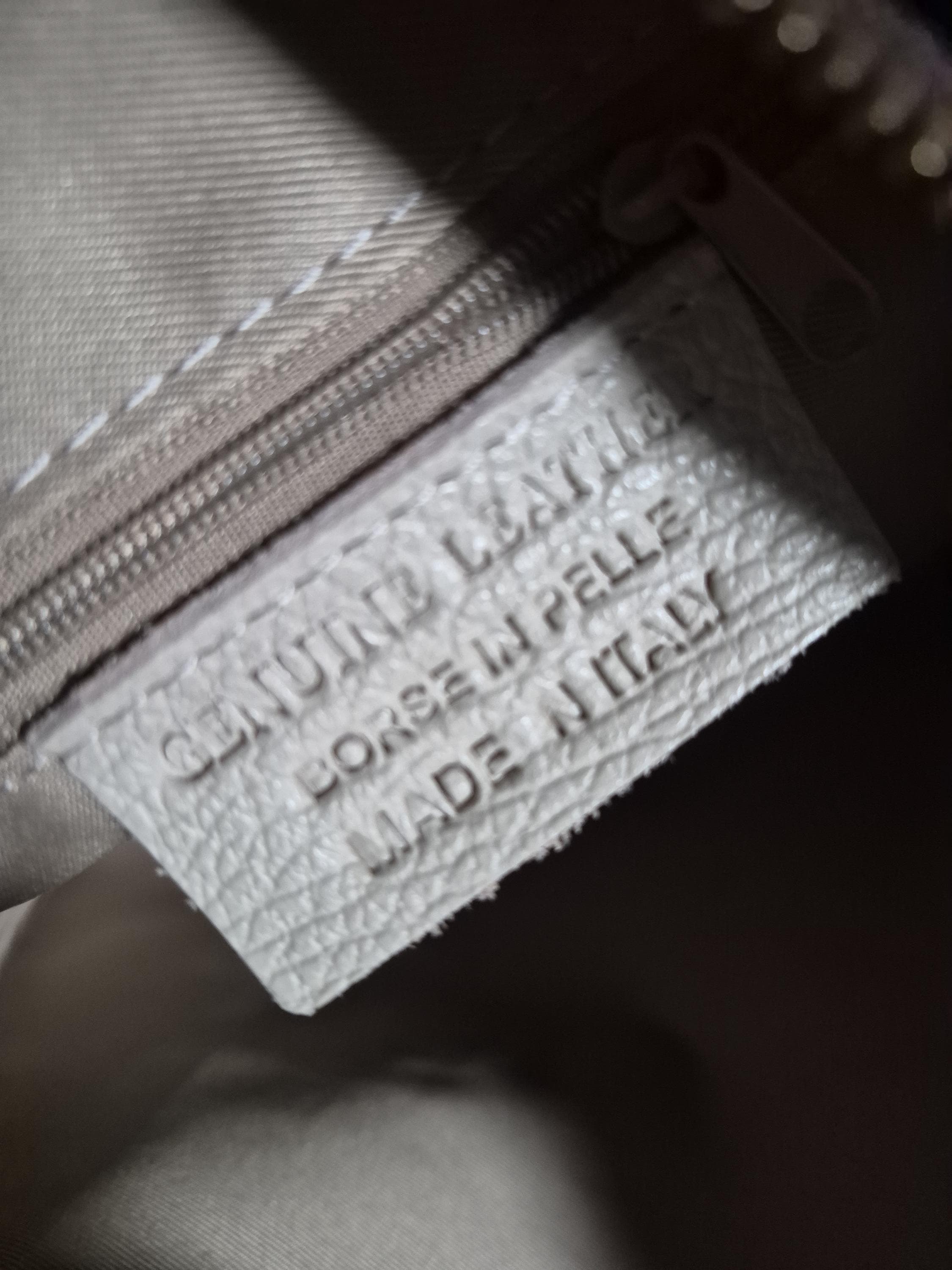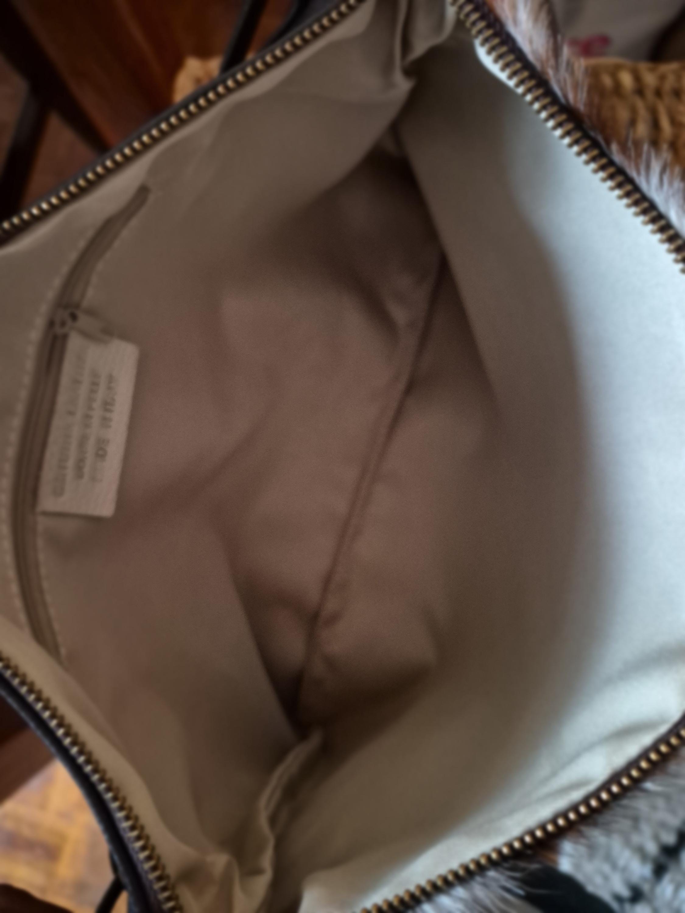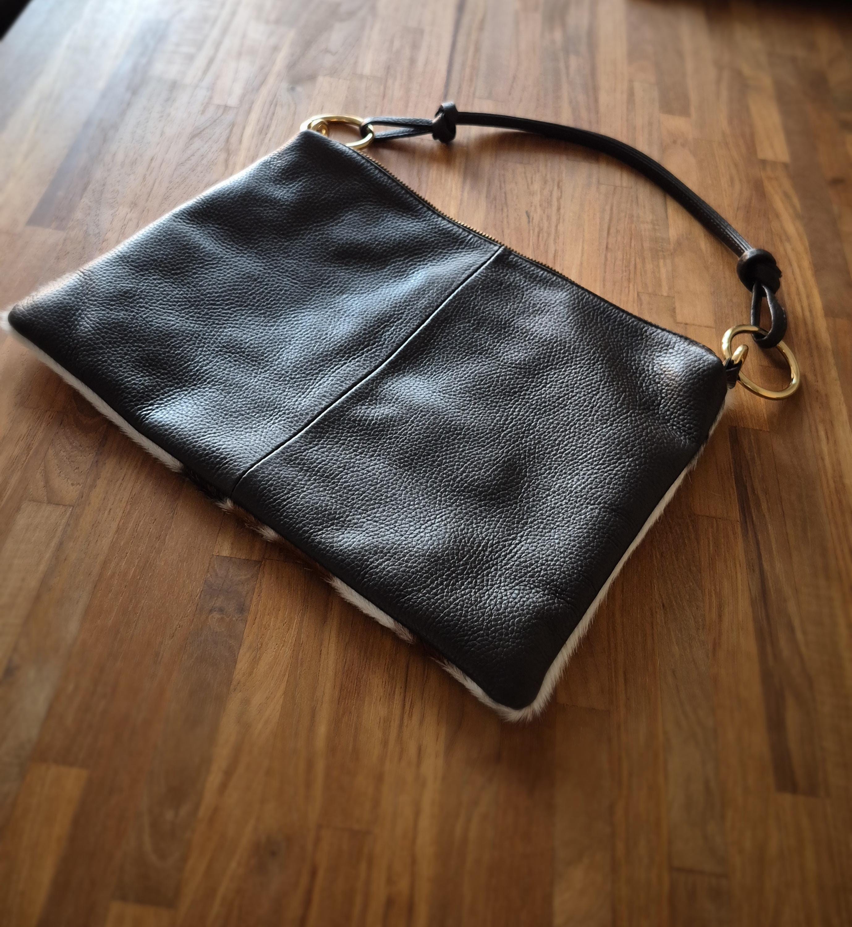 Materials: cowhide print, leather, gold-tone metal