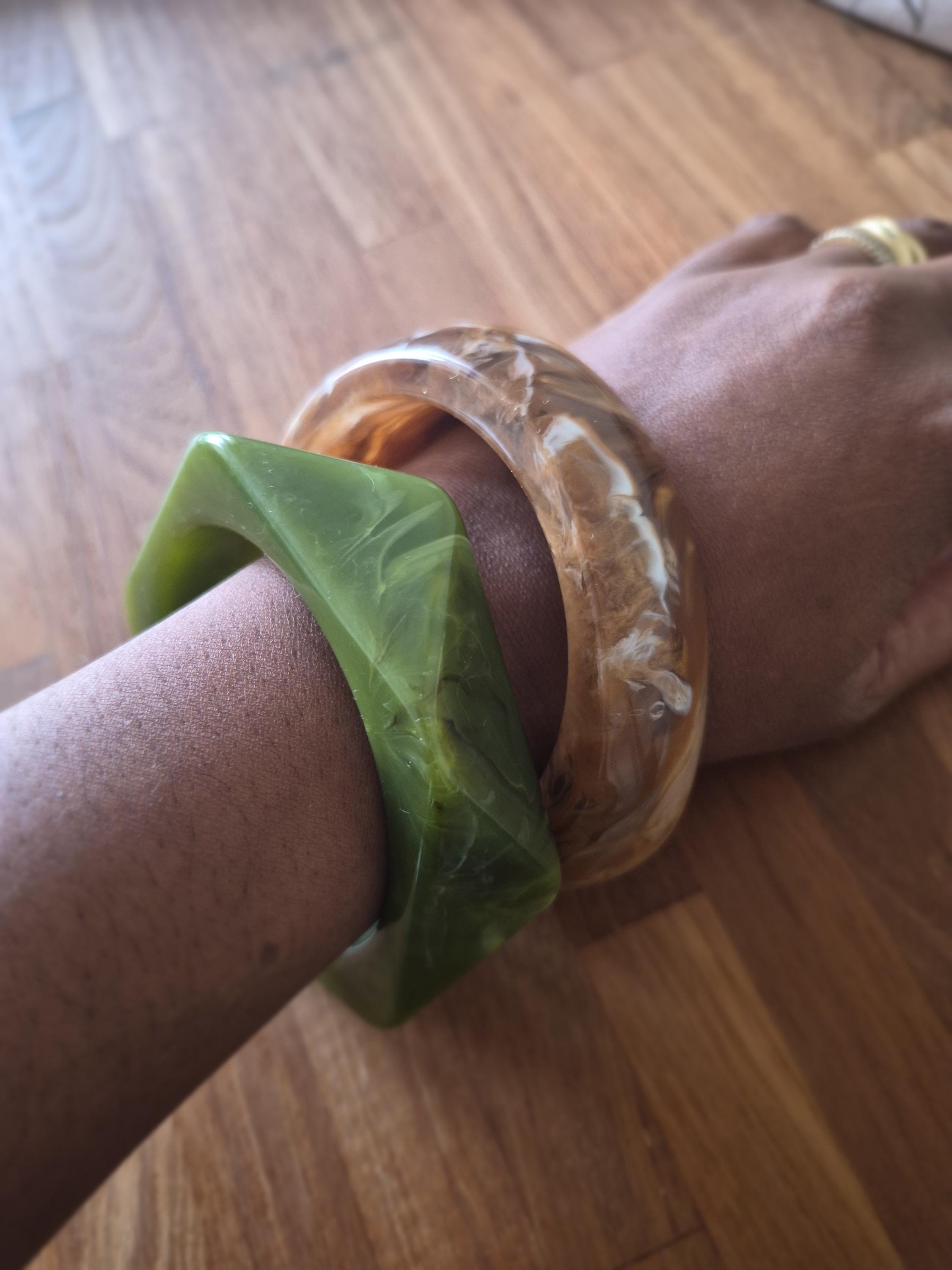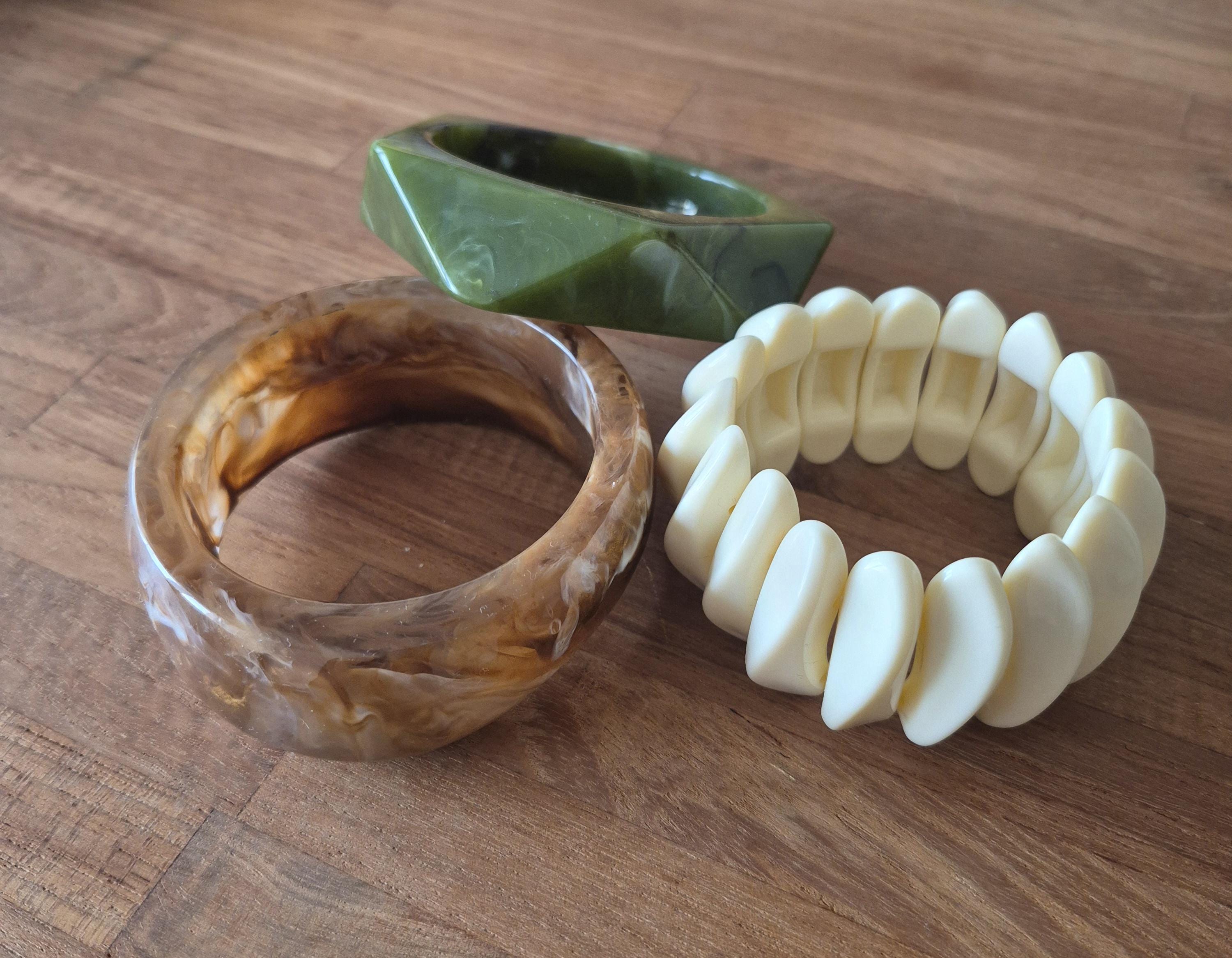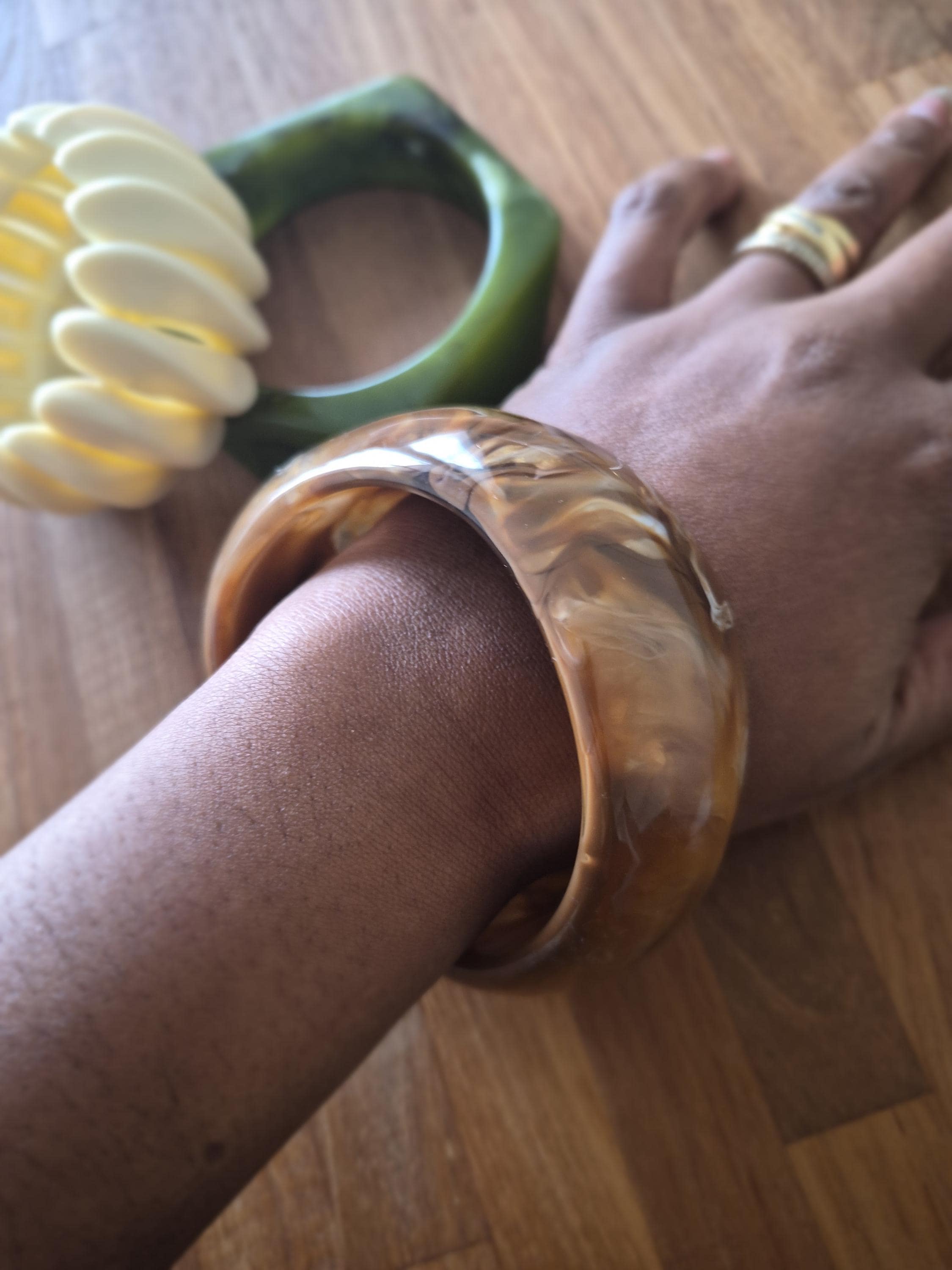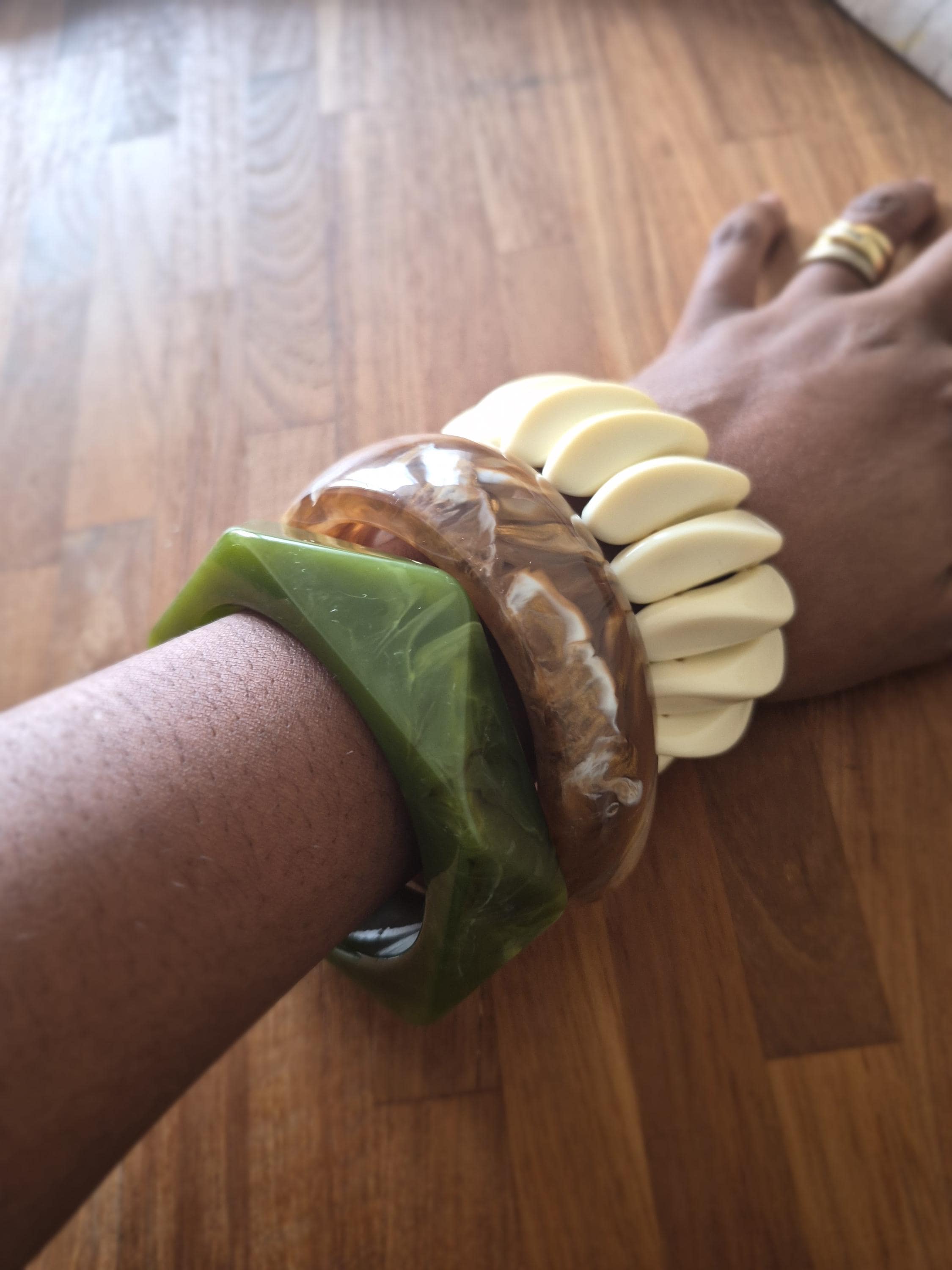 This set of 3 vintage resin bracelets is a true tribute to the elegance of the 70s. The brown, khaki green and ivory colors harmonize beautifully for a look that is boho, chic and timeless.