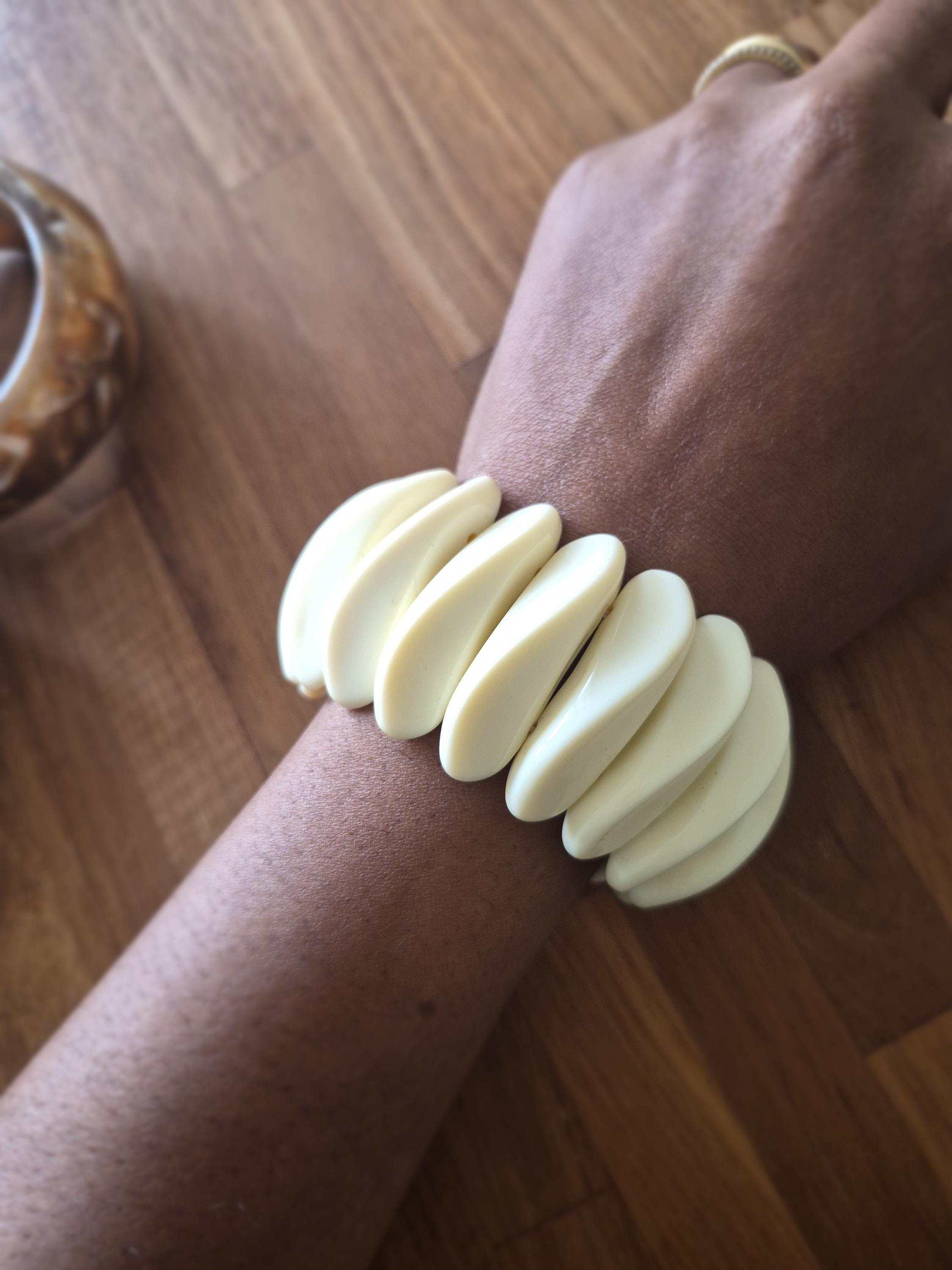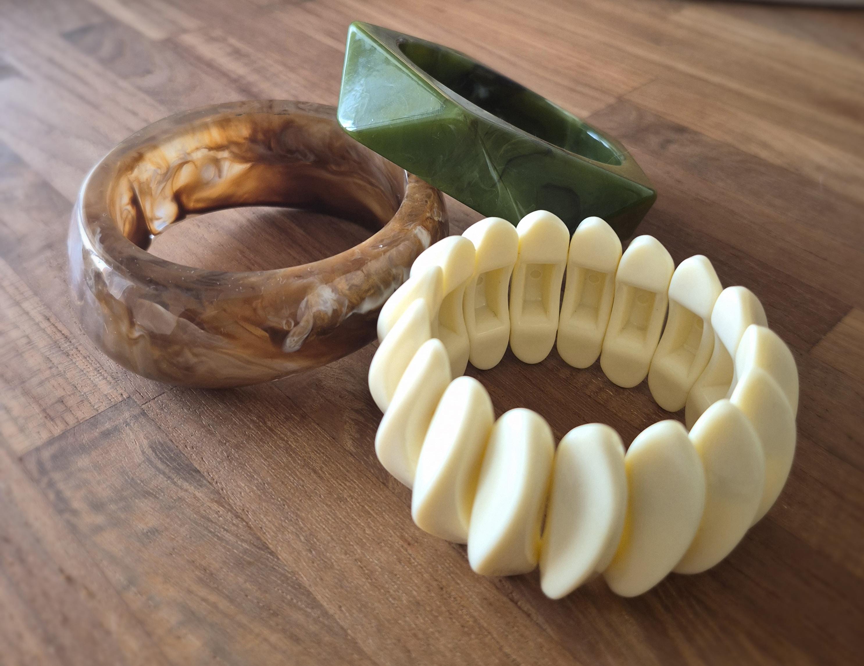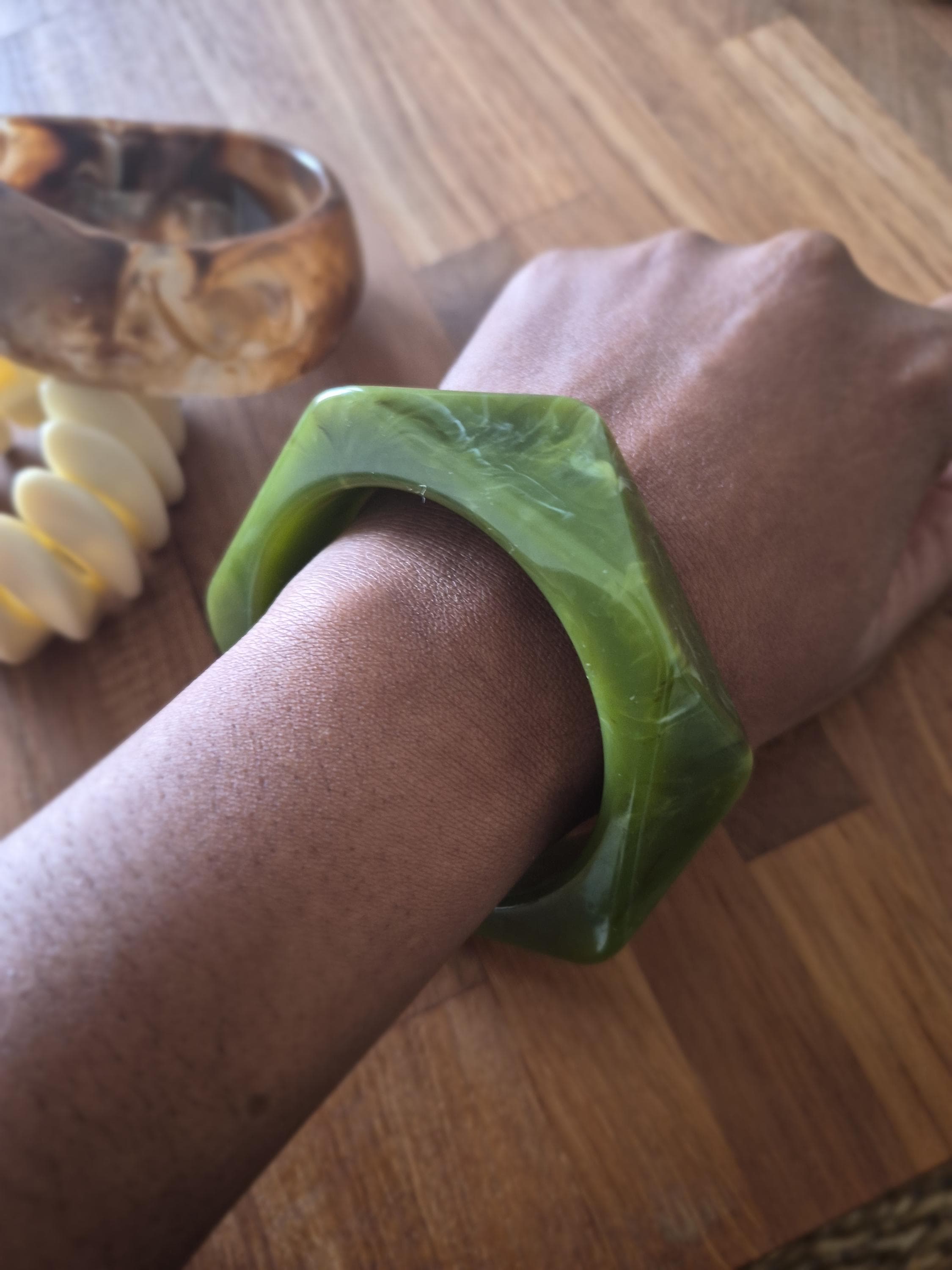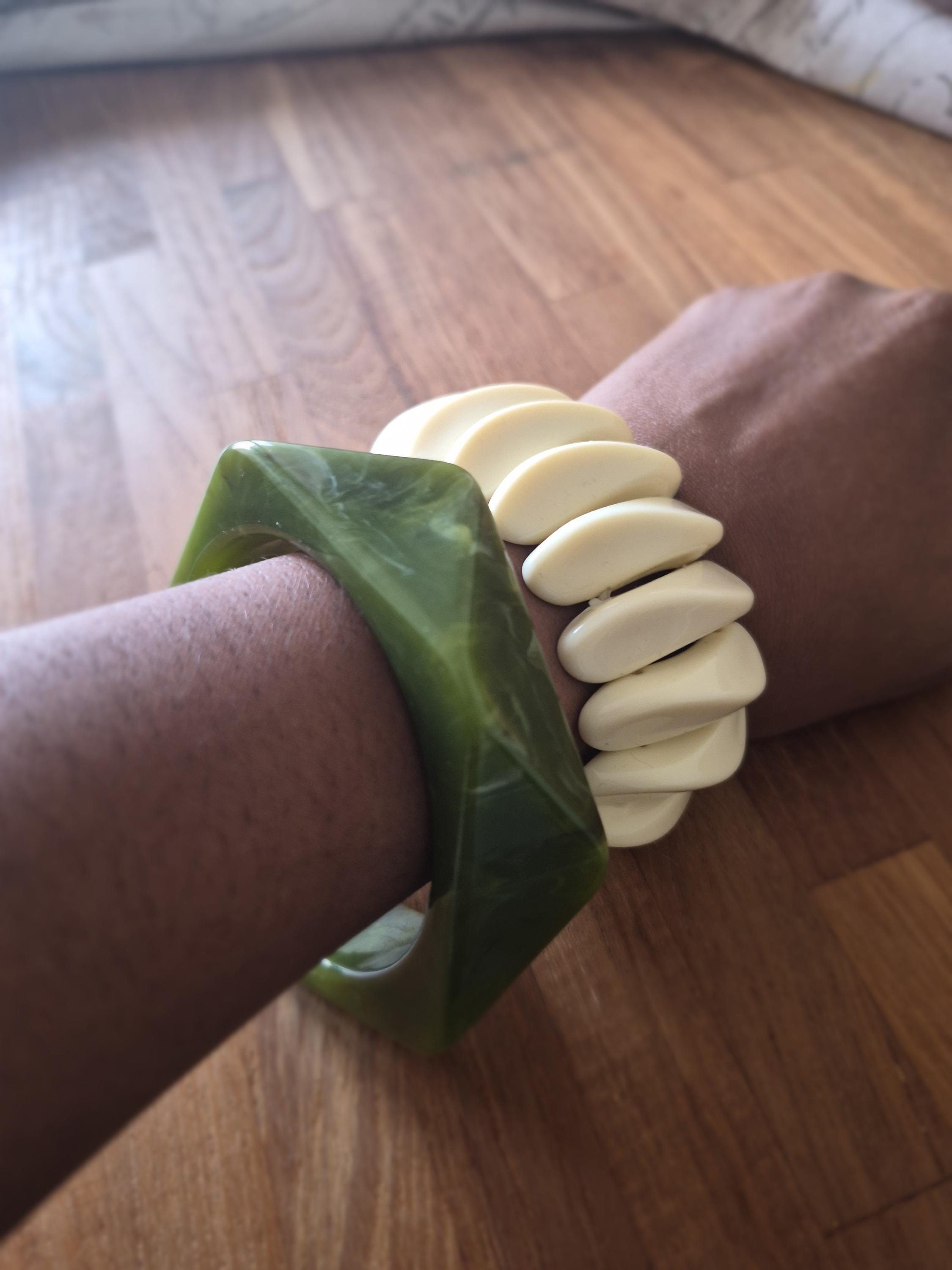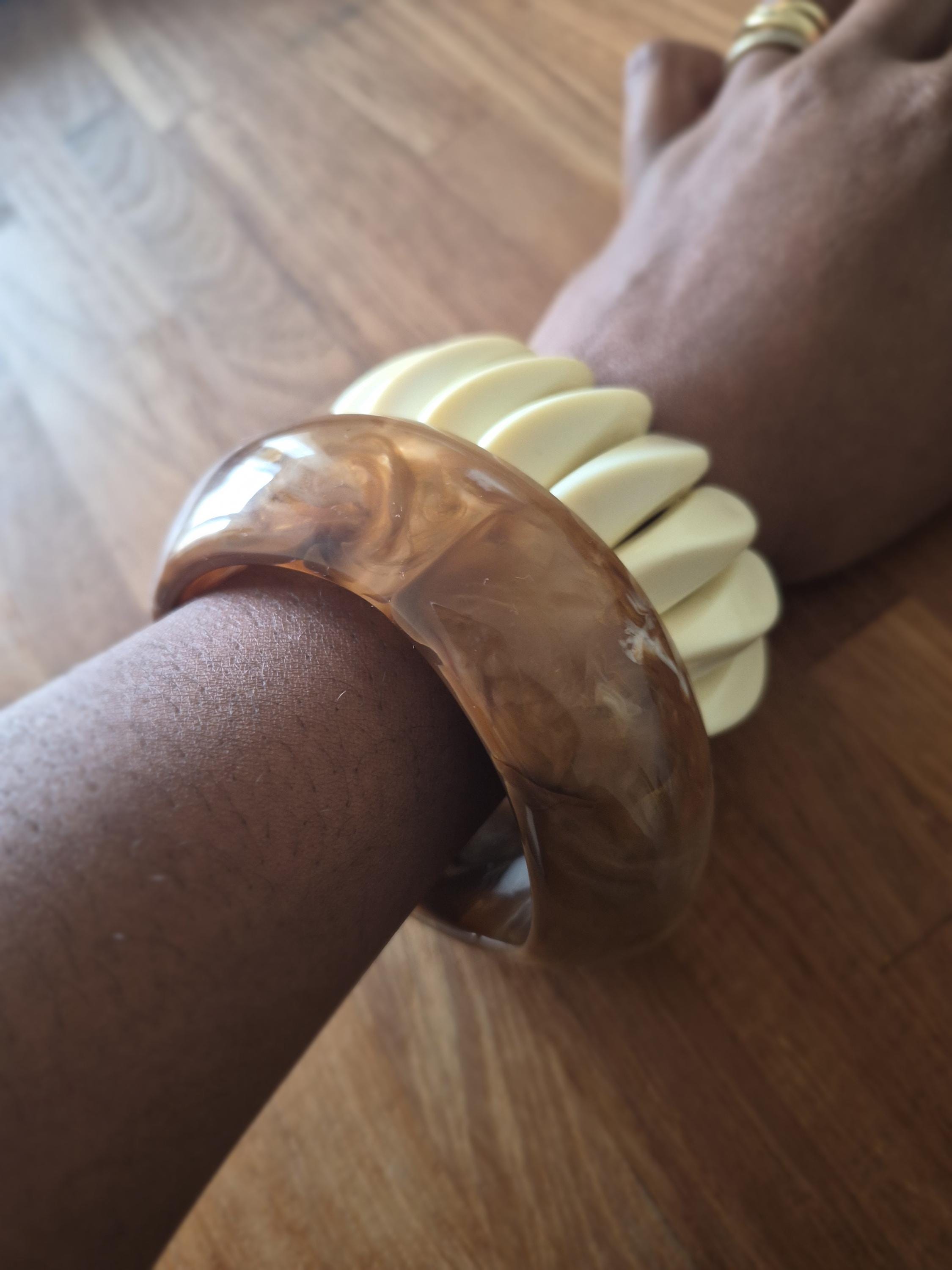 This set of 3 vintage resin bracelets is a true tribute to the elegance of the 70s. The brown, khaki green and ivory colors harmonize beautifully for a look that is boho, chic and timeless.