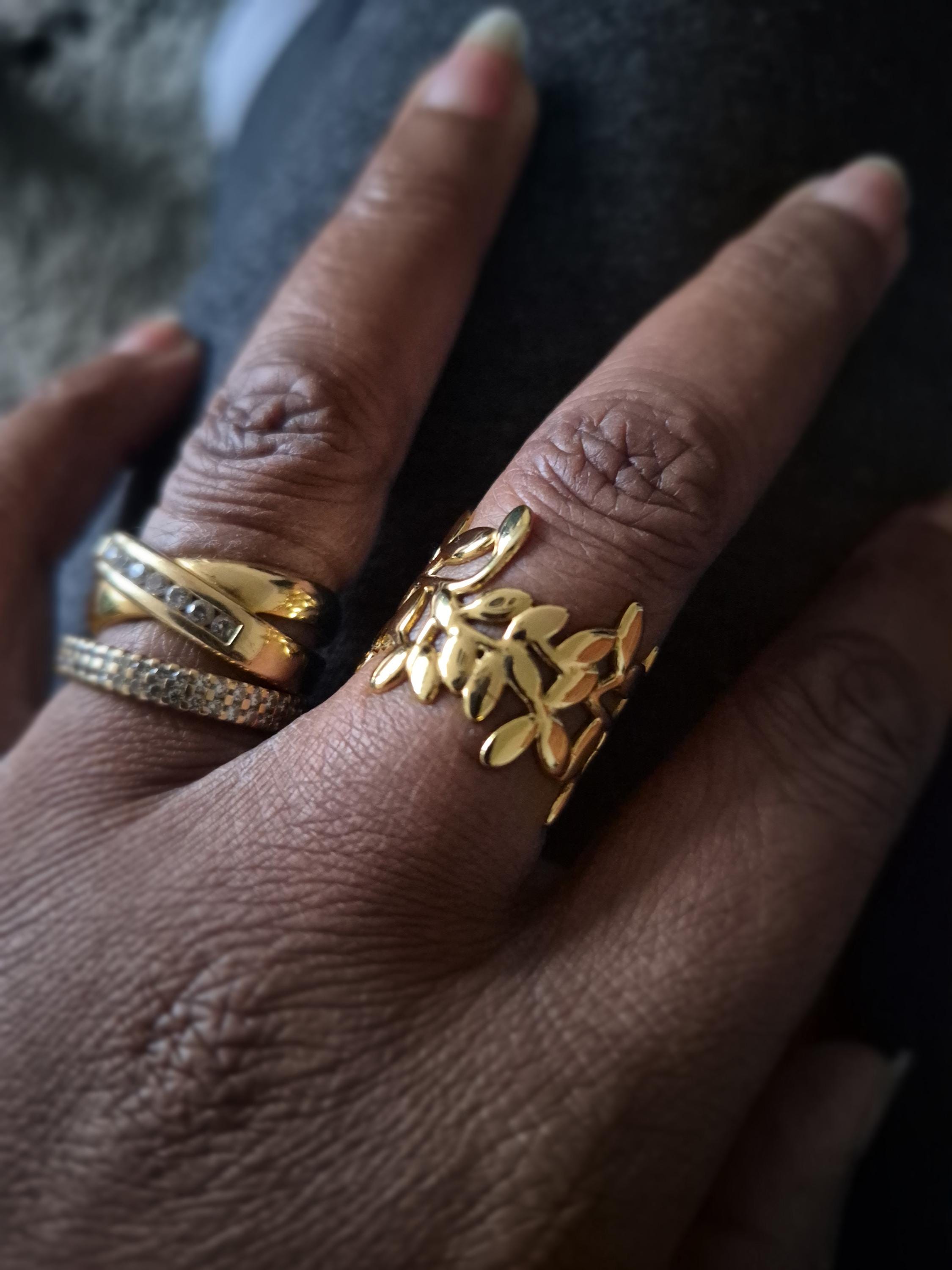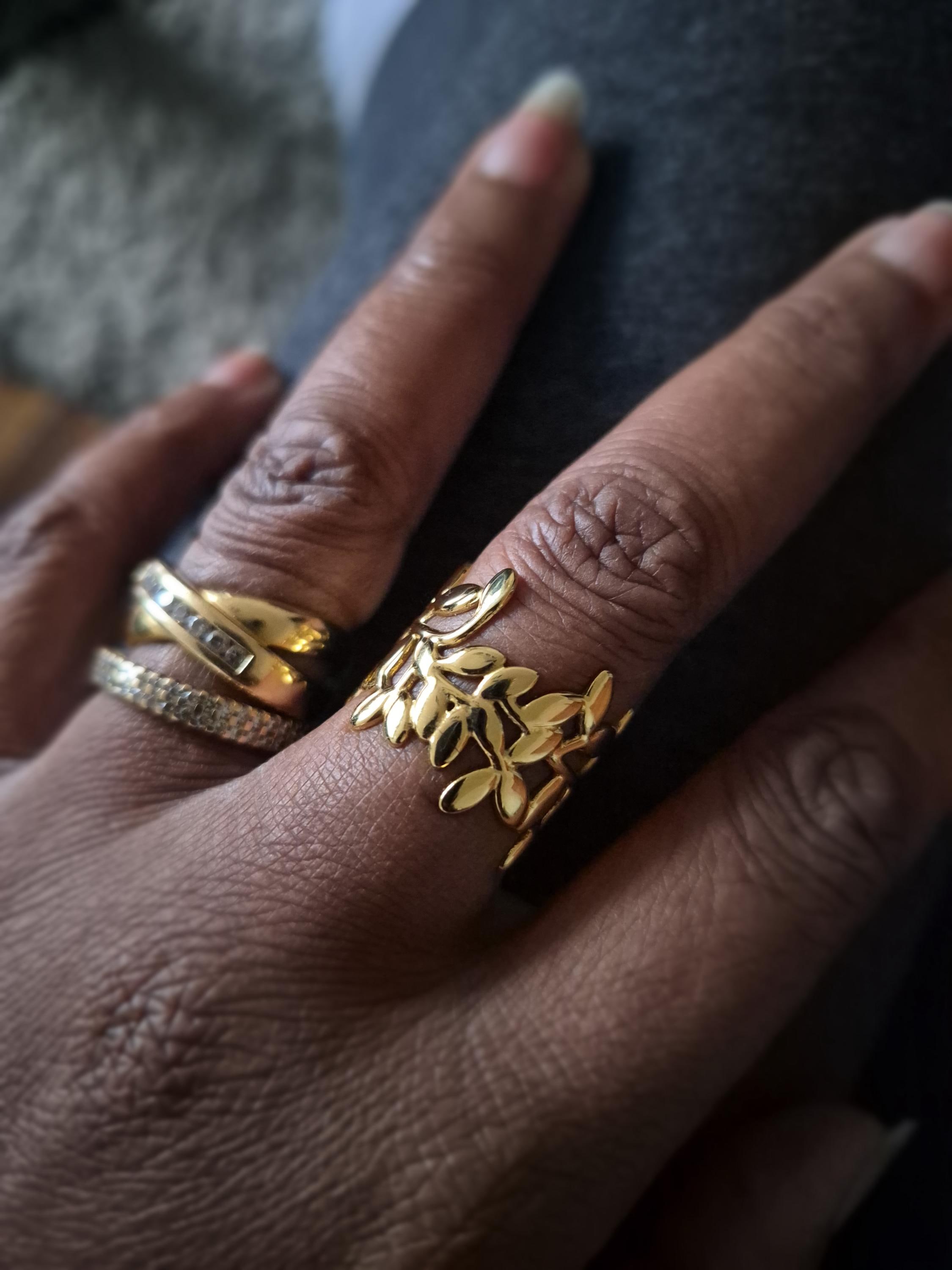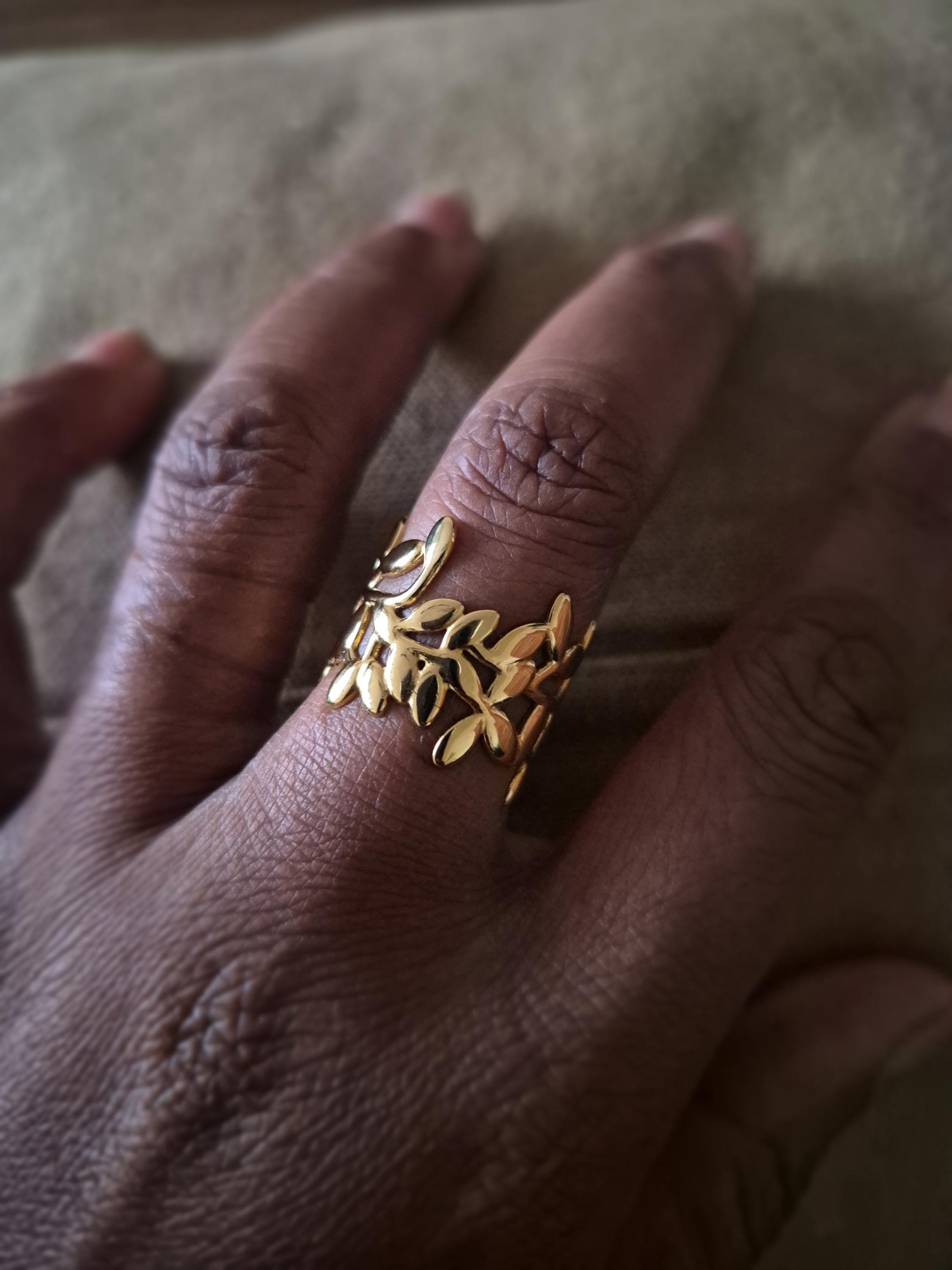 This gold ring, inspired by laurel leaves, adds a natural, feminine, and luminous touch to your style. A delicate piece of jewelry, perfect for adorning your hands every day.