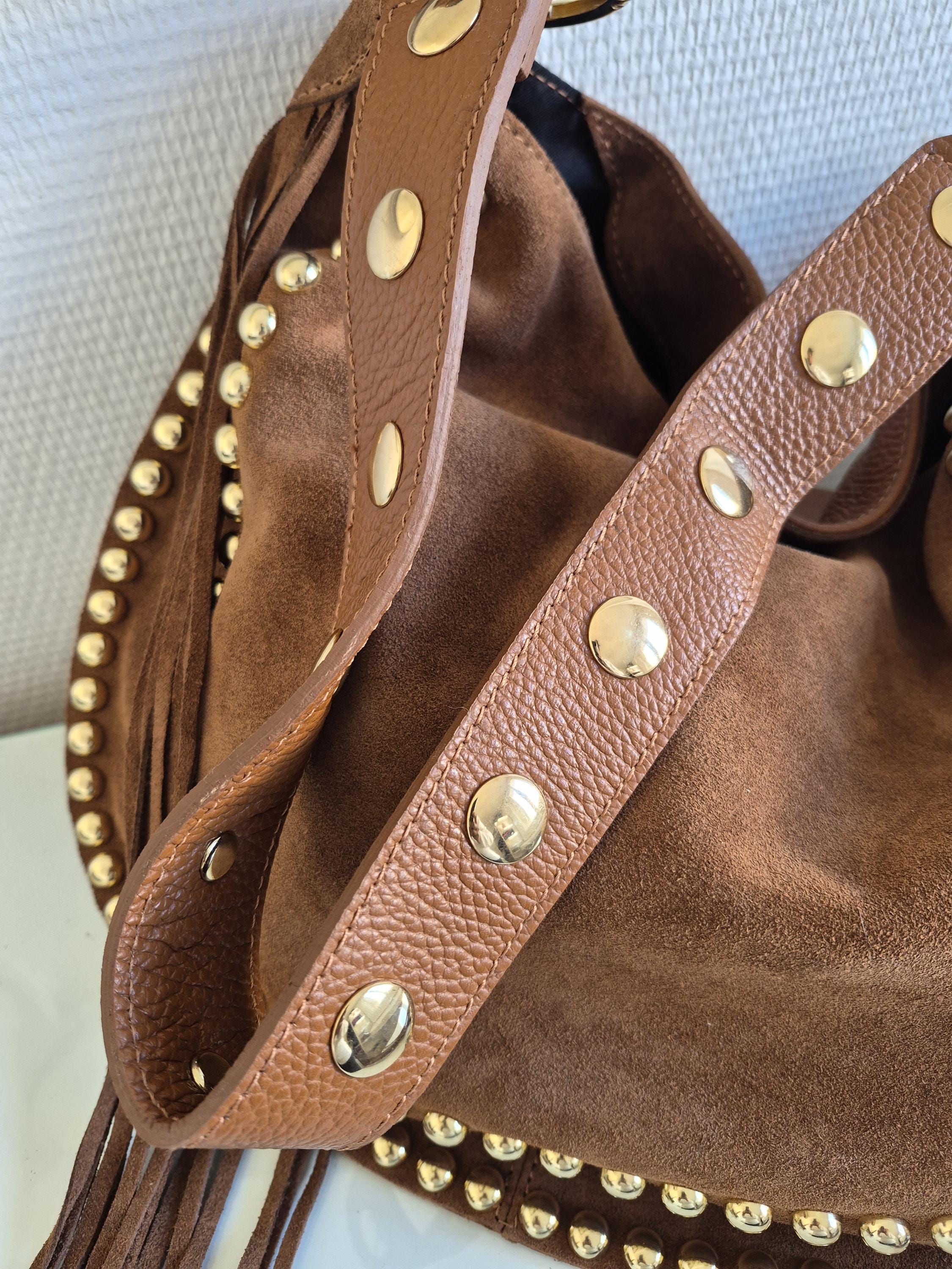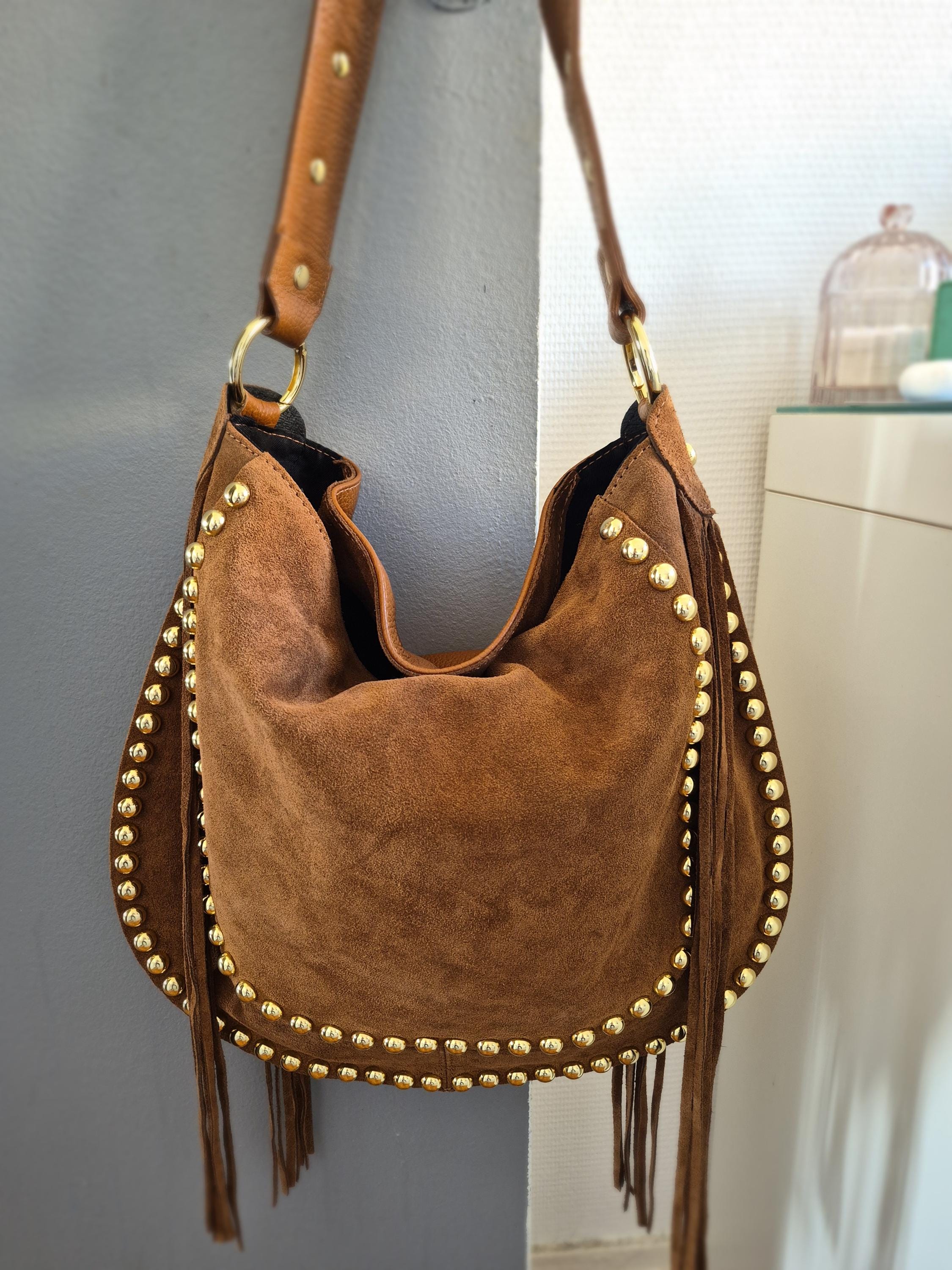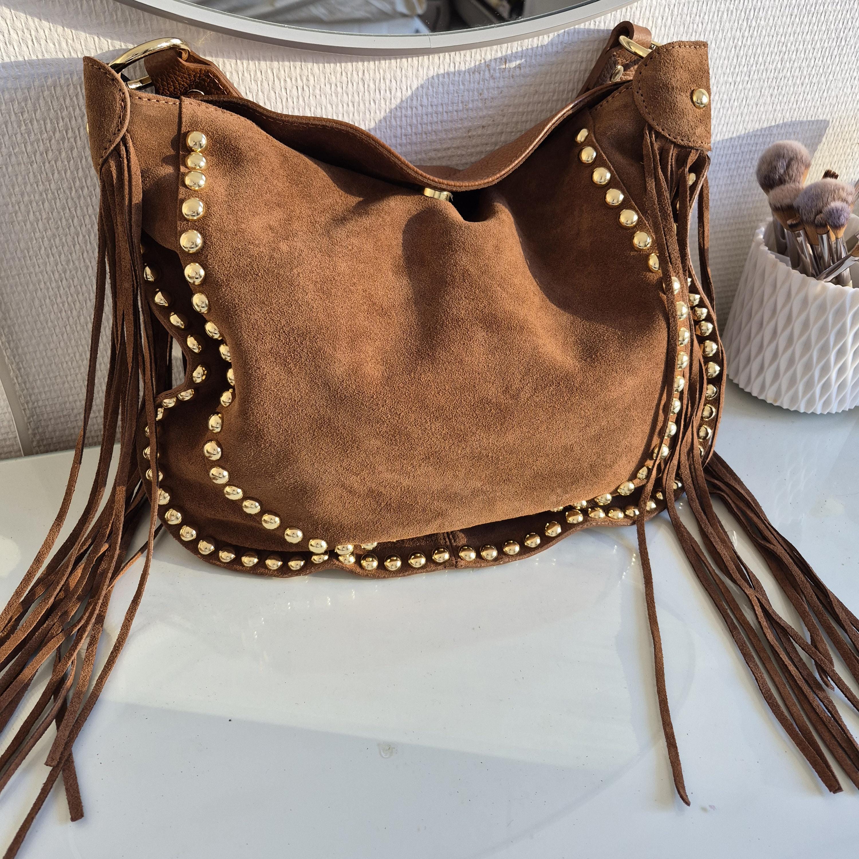 With its soft-touch brown suede leather, bohemian fringes and luminous gold studs, it adds a touch of character to all your outfits, from everyday wear to dressier occasions.