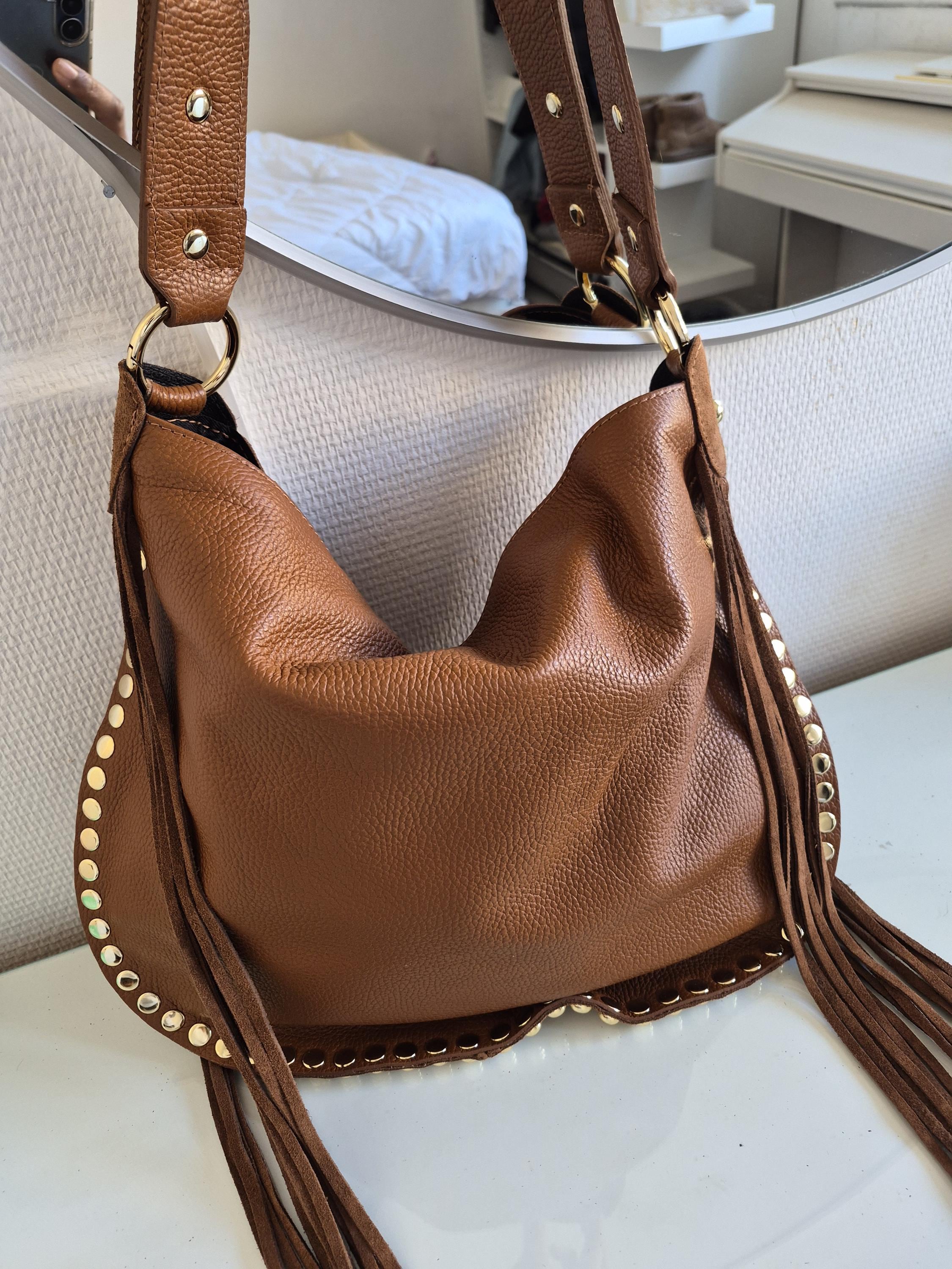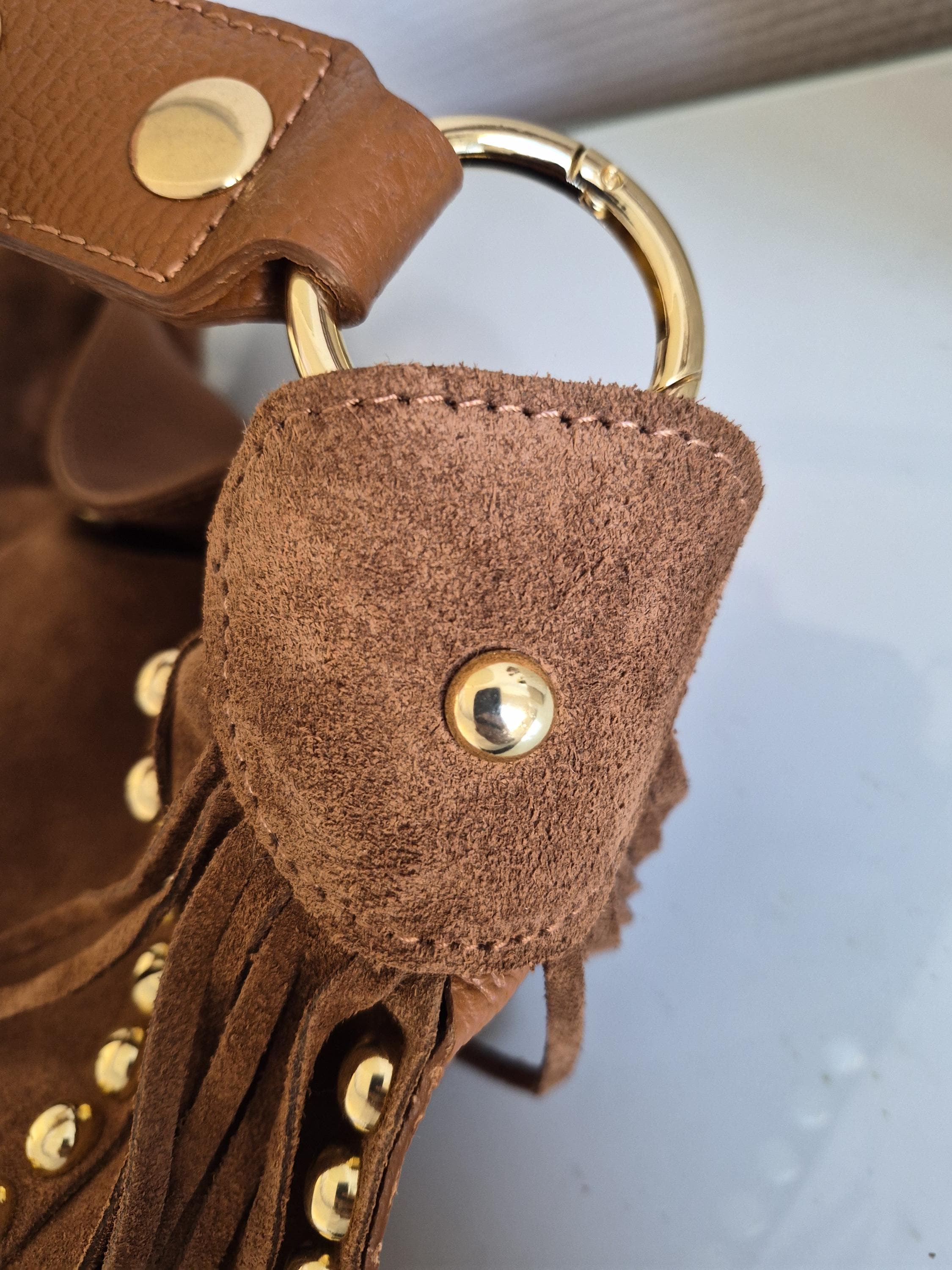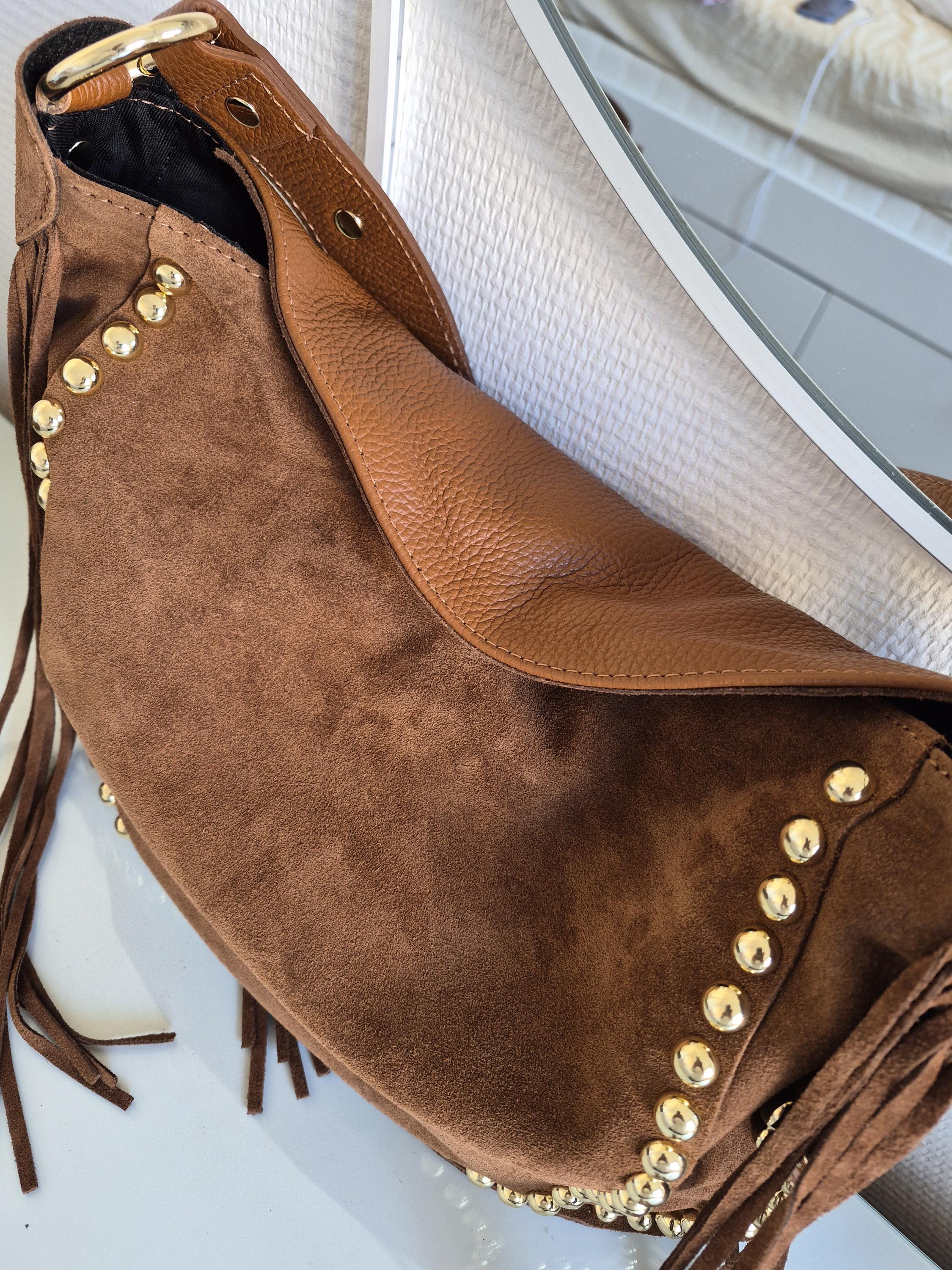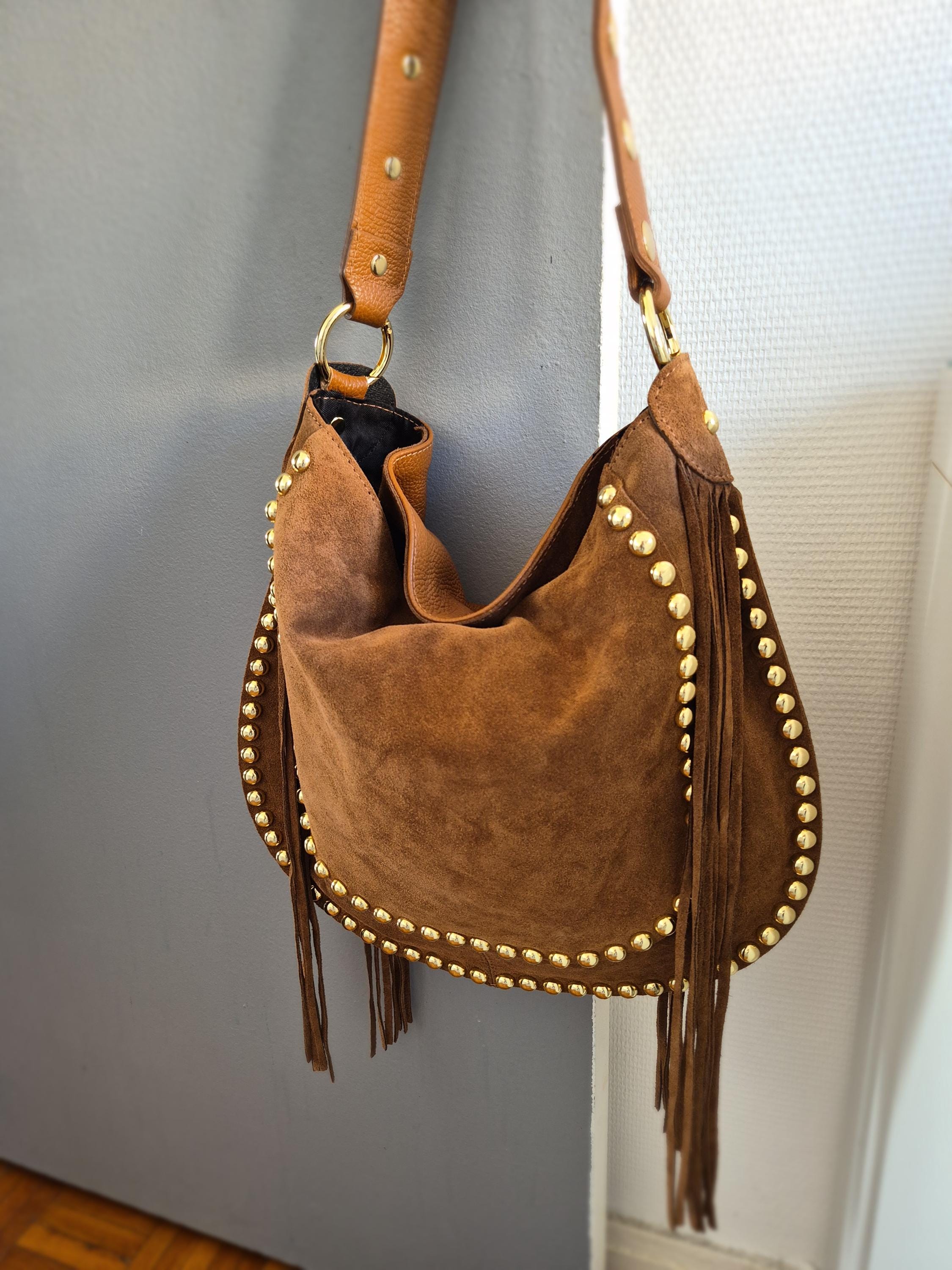 With its soft-touch brown suede leather, bohemian fringes and luminous gold studs, it adds a touch of character to all your outfits, from everyday wear to dressier occasions.
