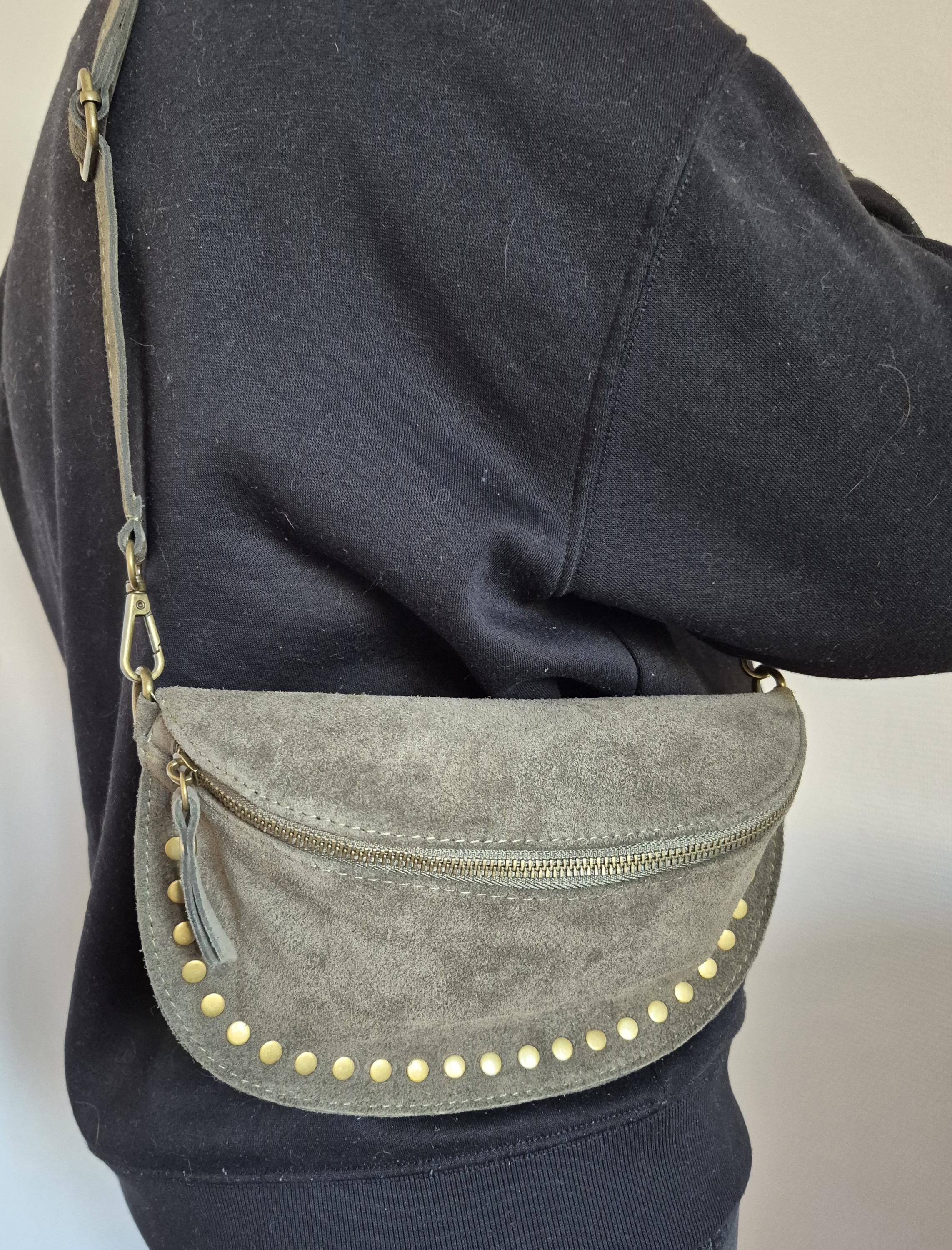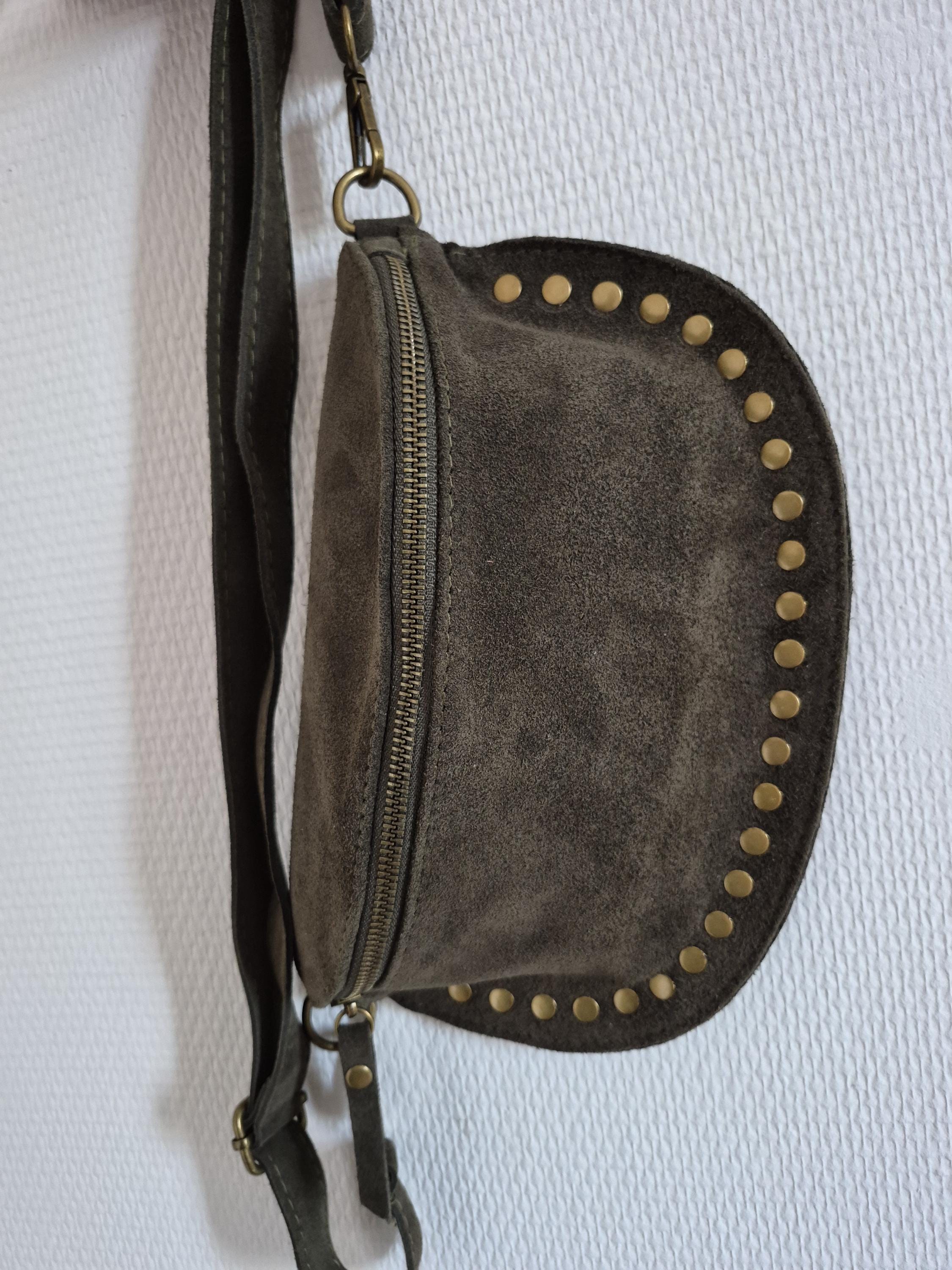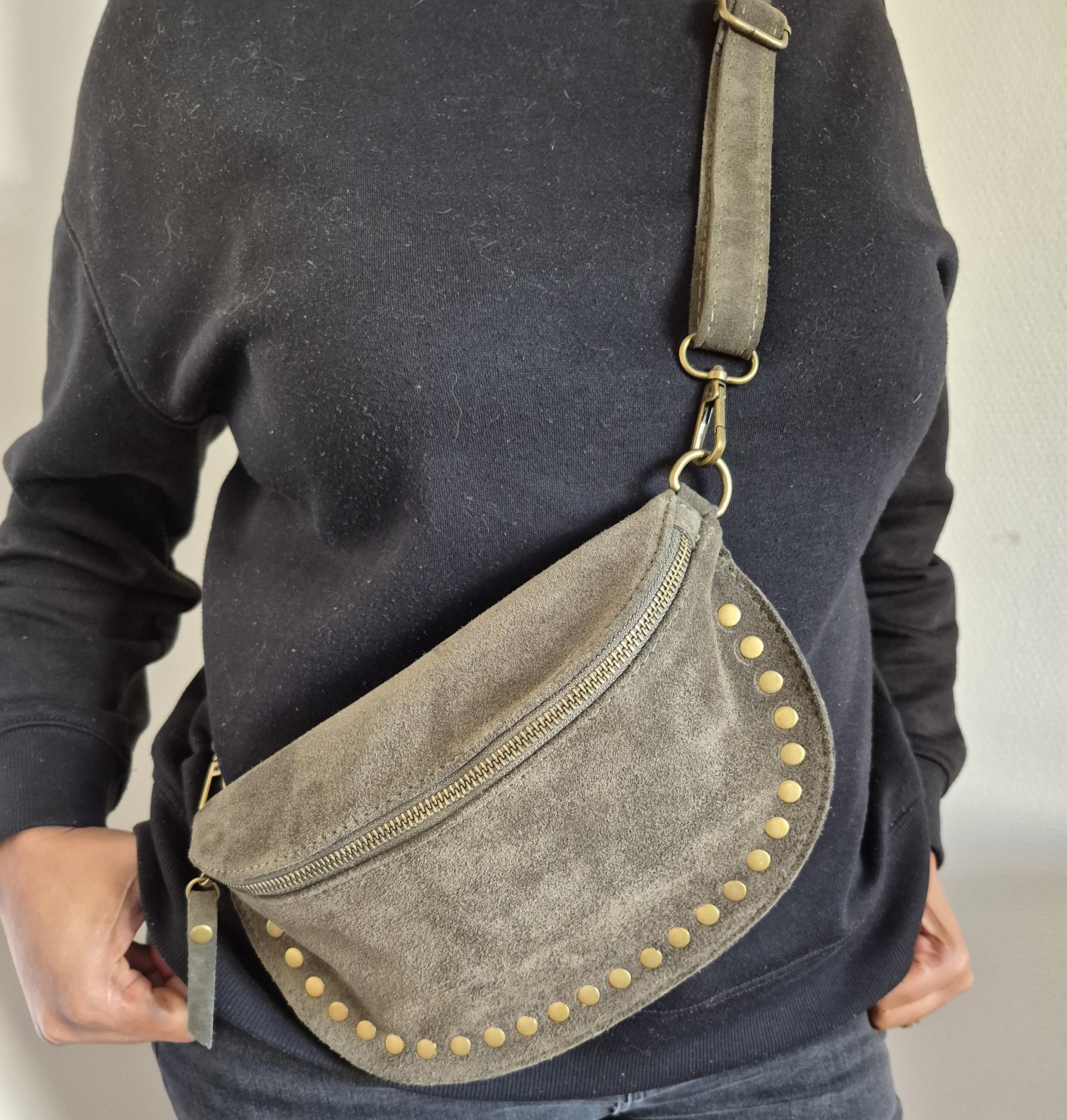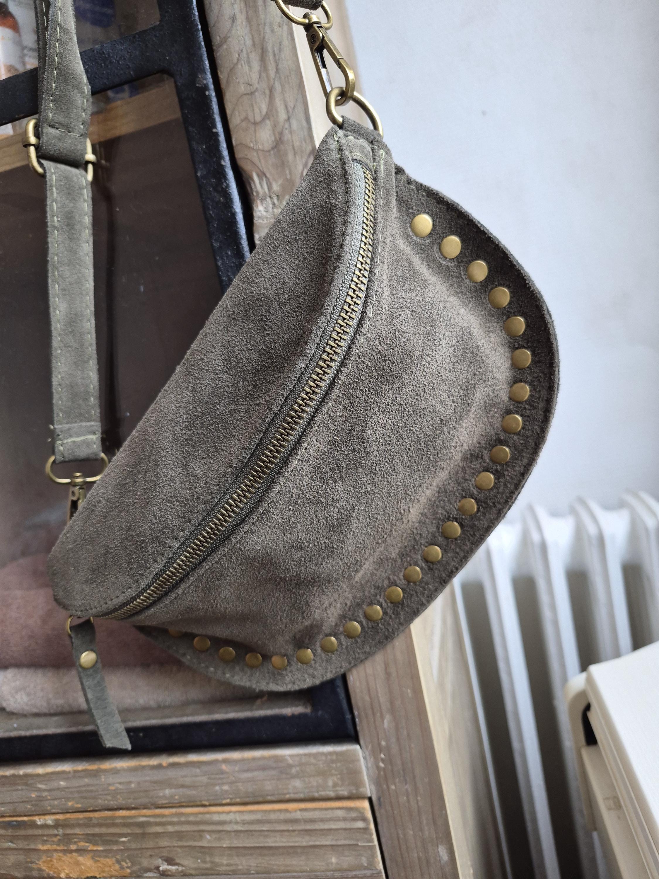 Green suede leather fanny pack with a timeless boho-chic style. Ideal for women looking for a practical, elegant, and trendy accessory.