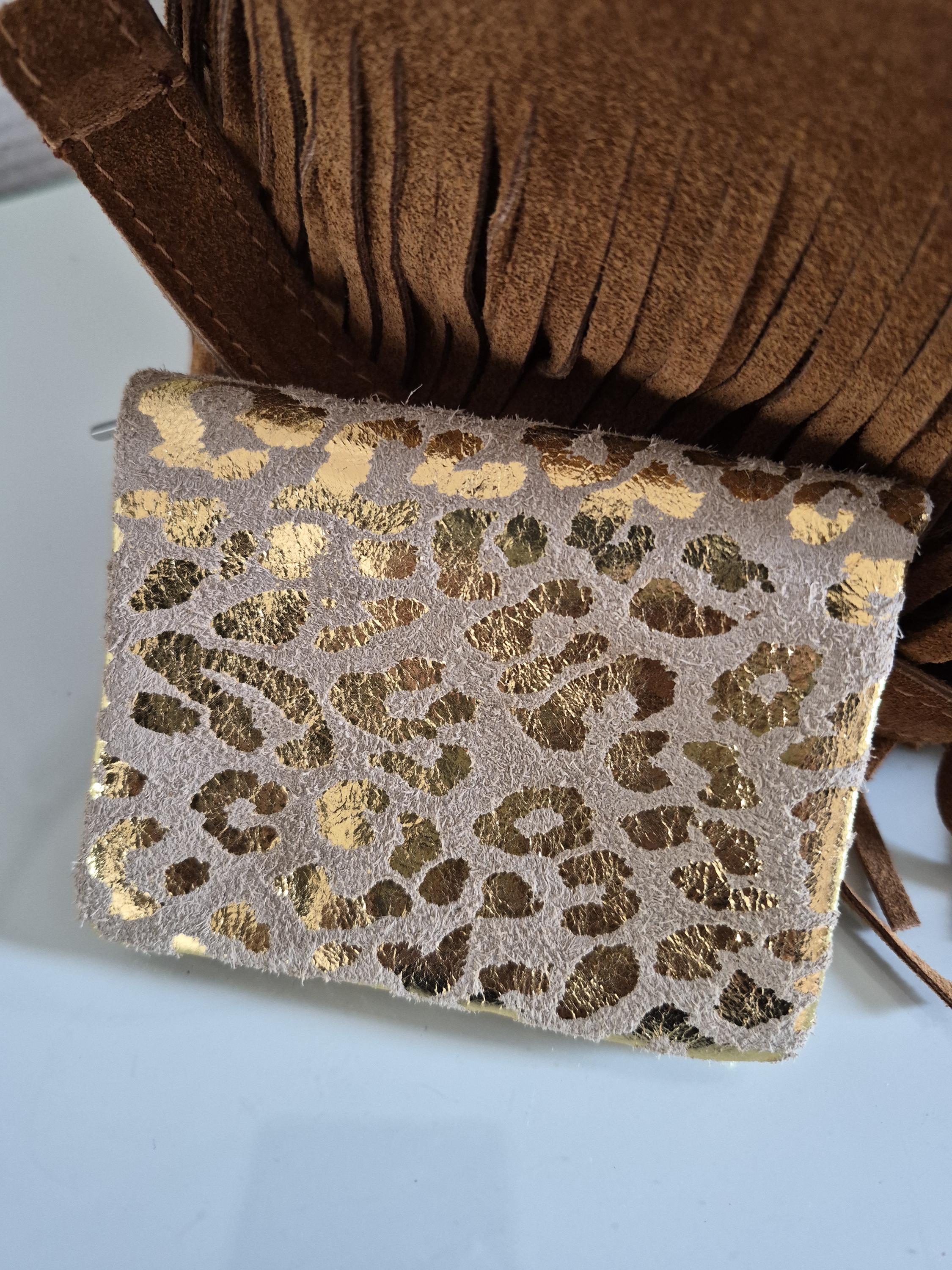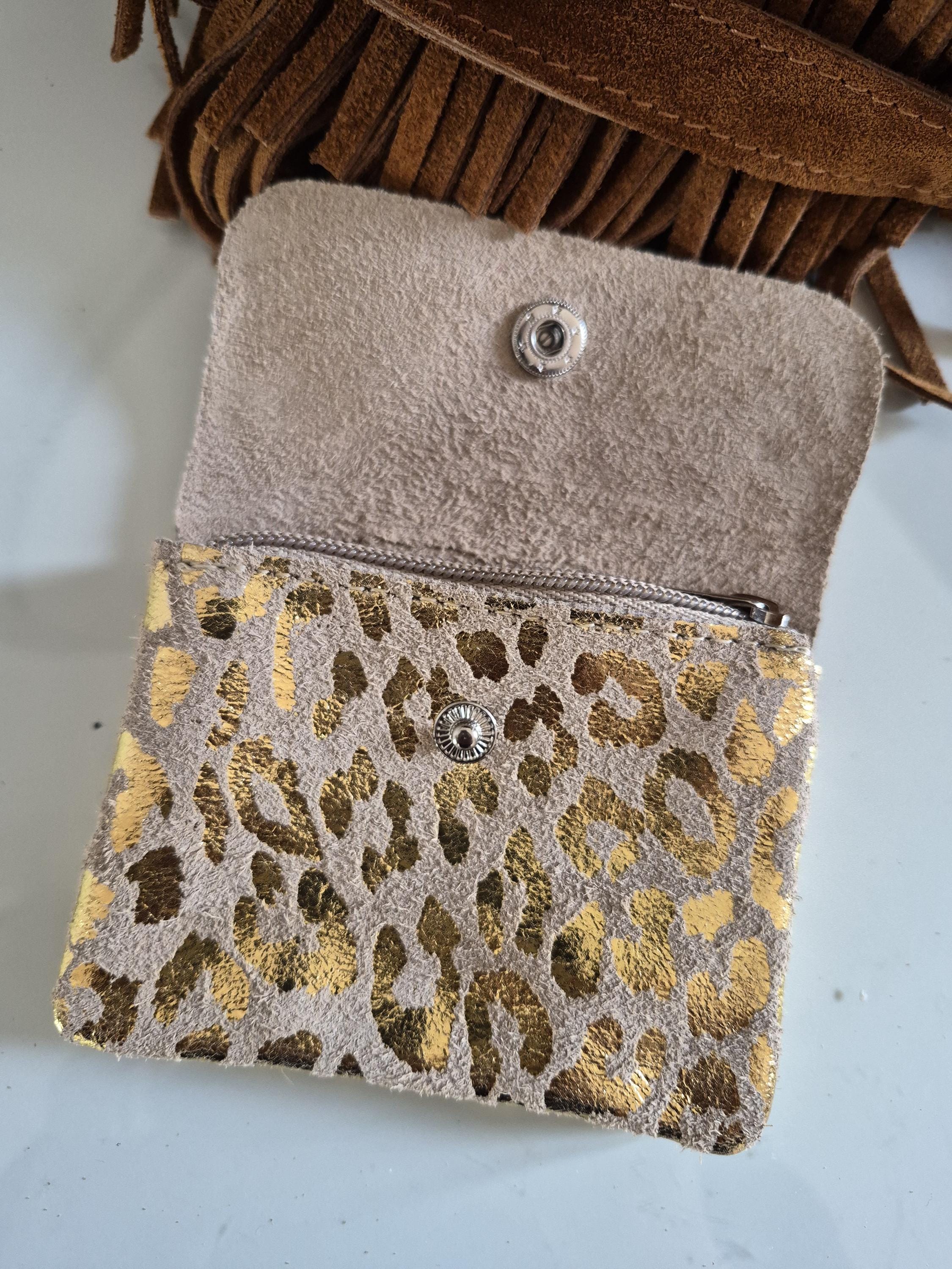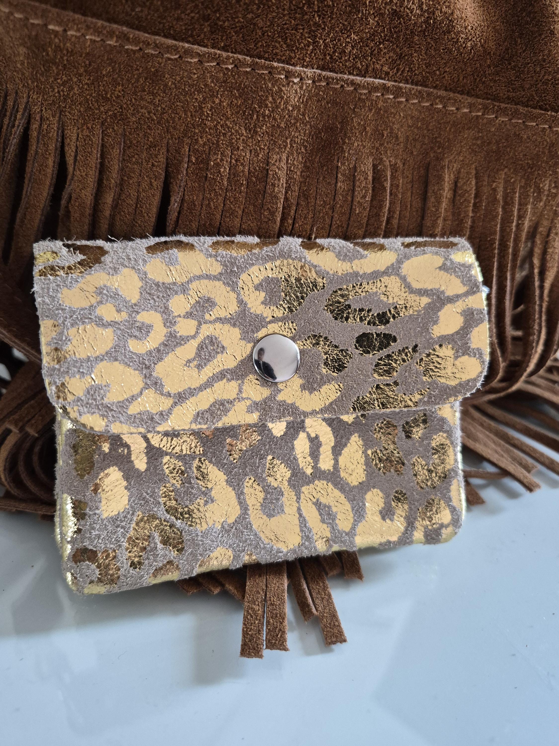 This small suede leather purse with a gold leopard print is the perfect accessory for those who like to combine practicality and style.