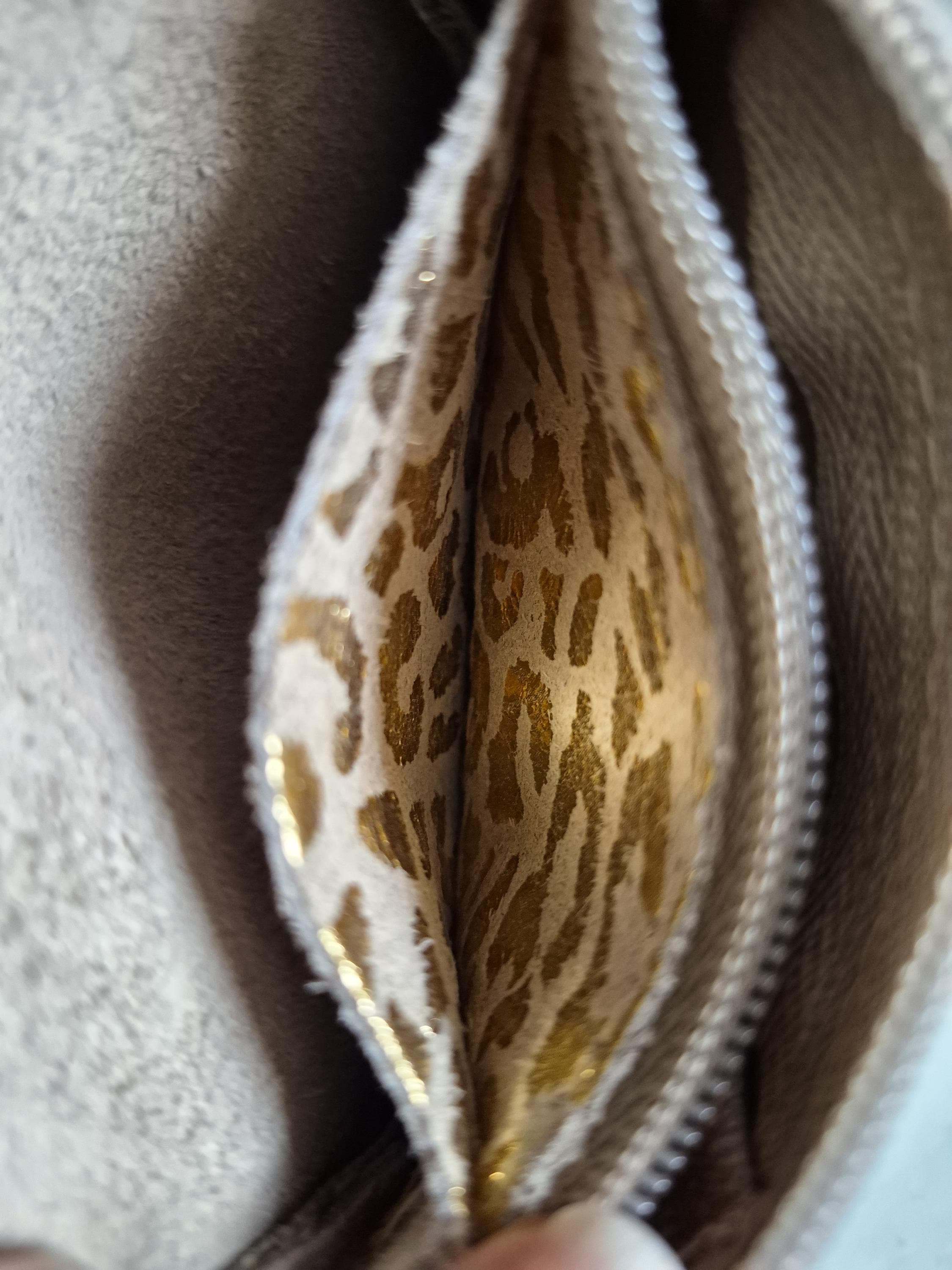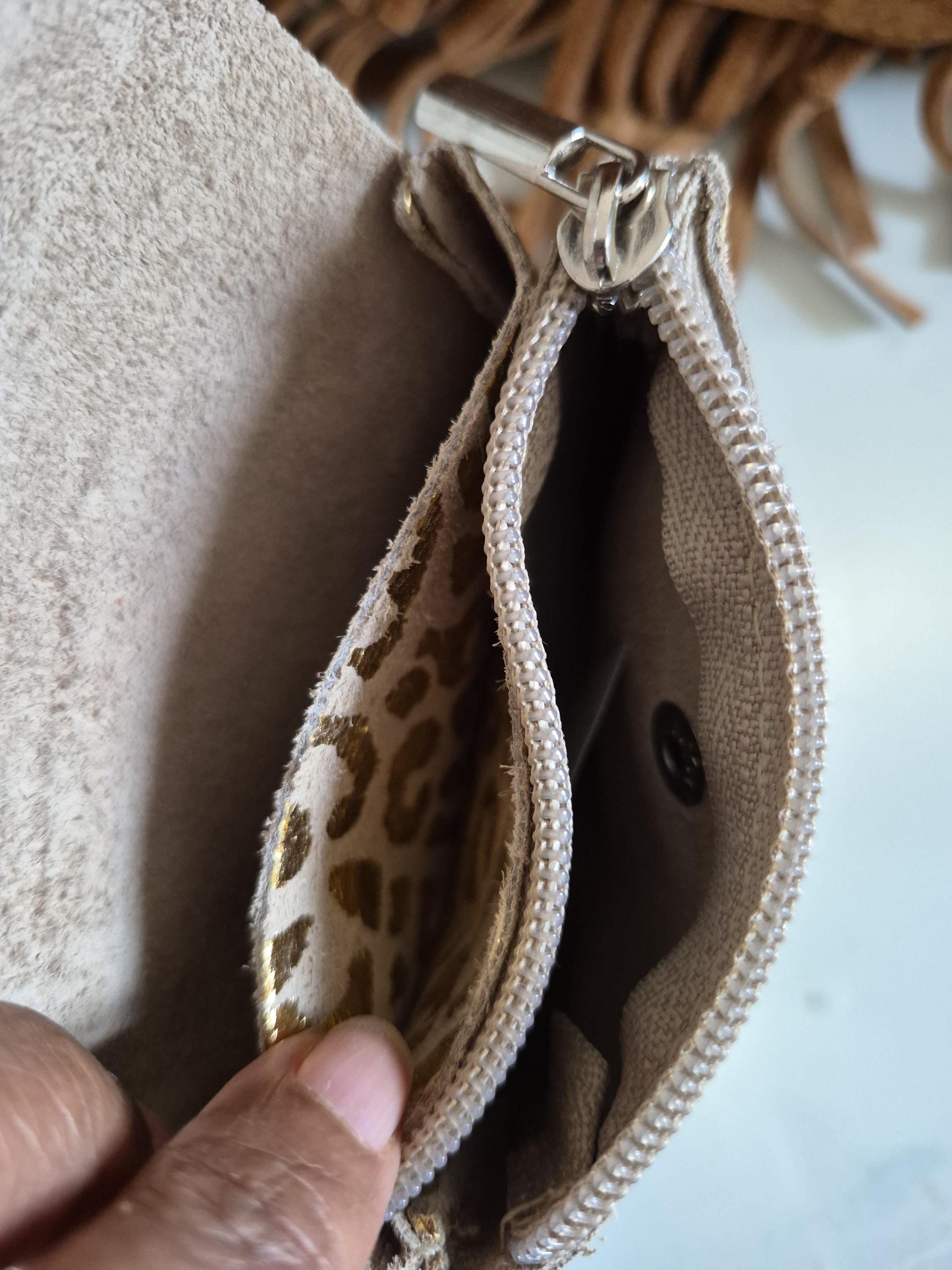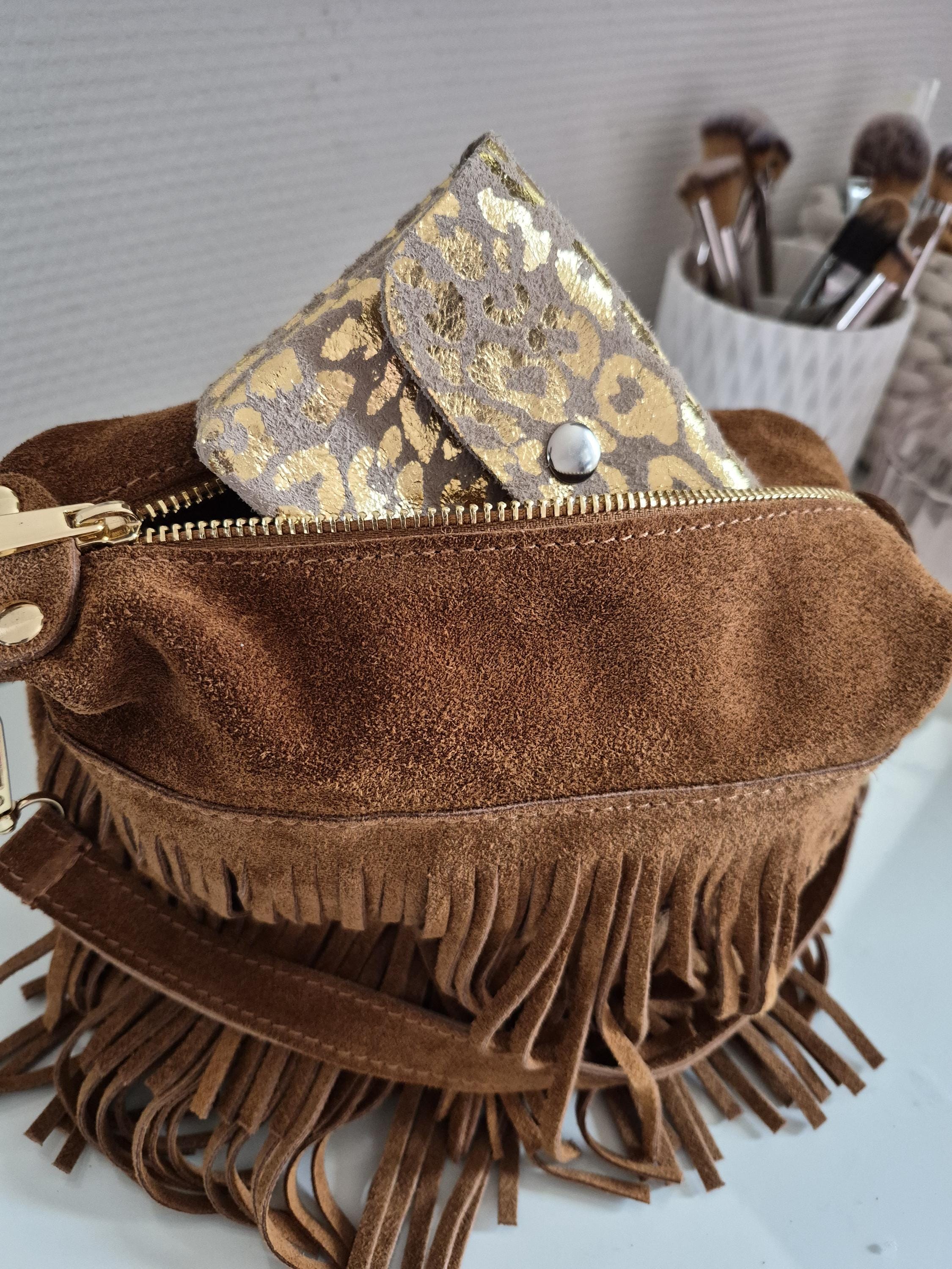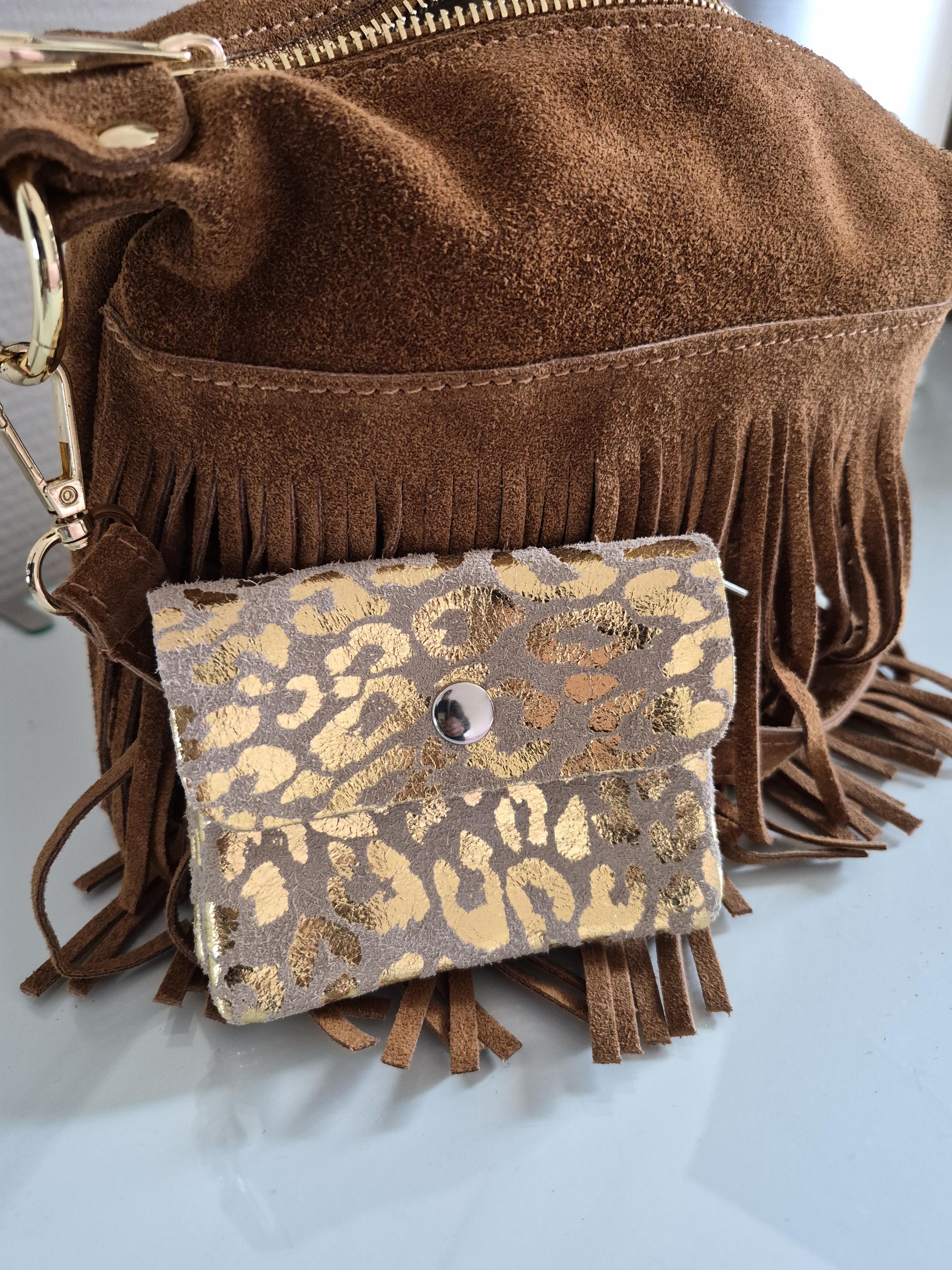 This small suede leather purse with a gold leopard print is the perfect accessory for those who like to combine practicality and style.