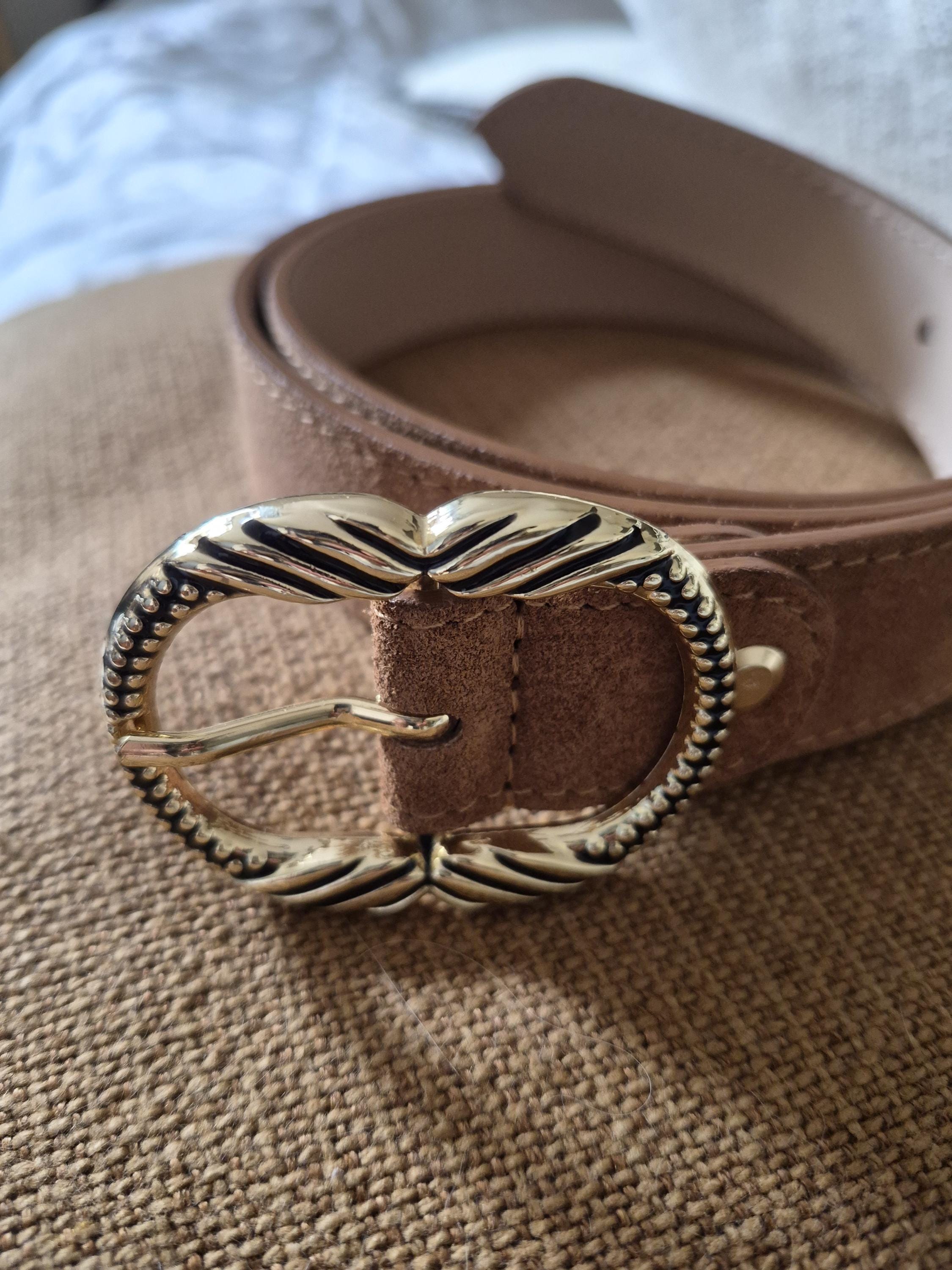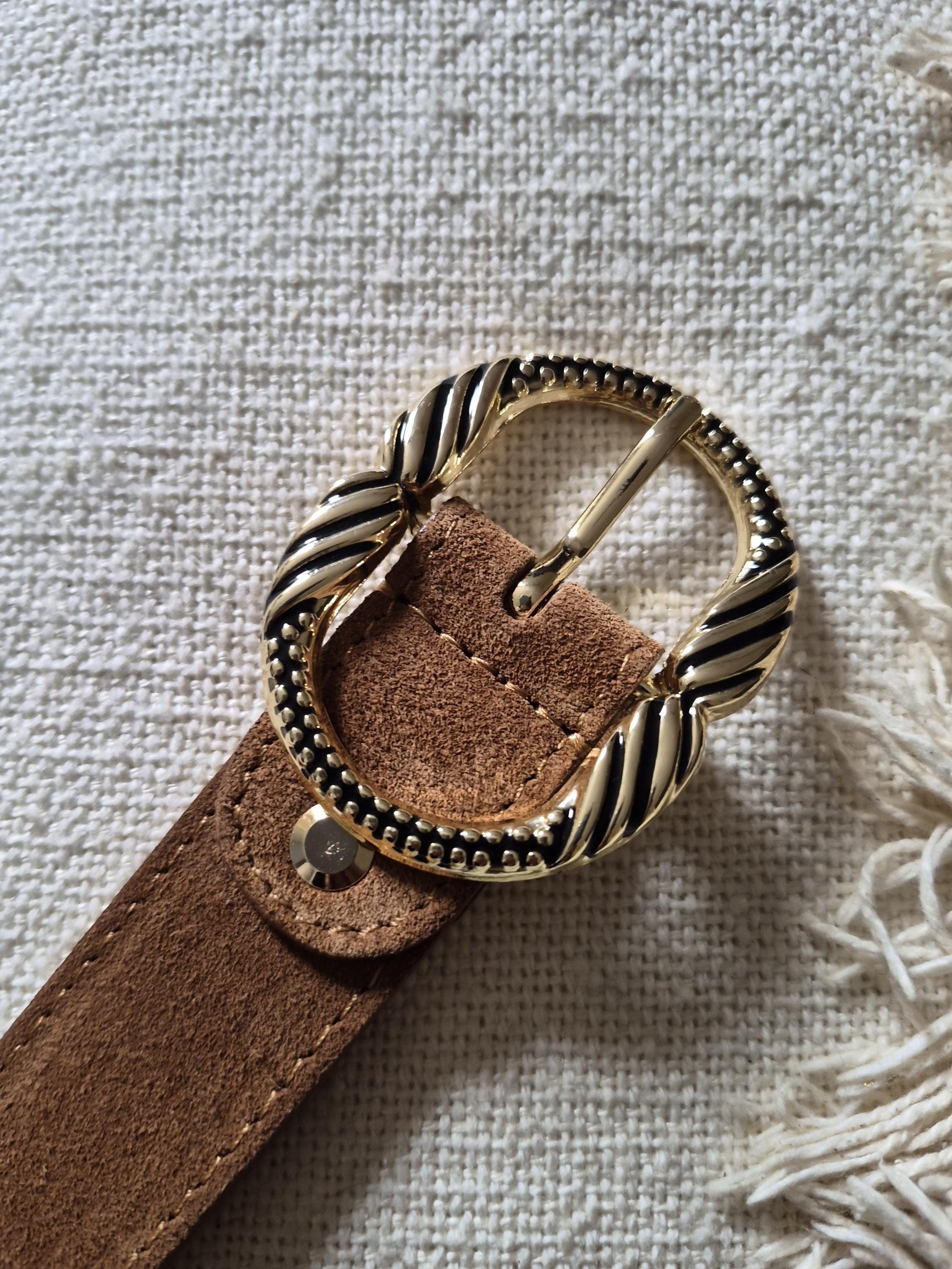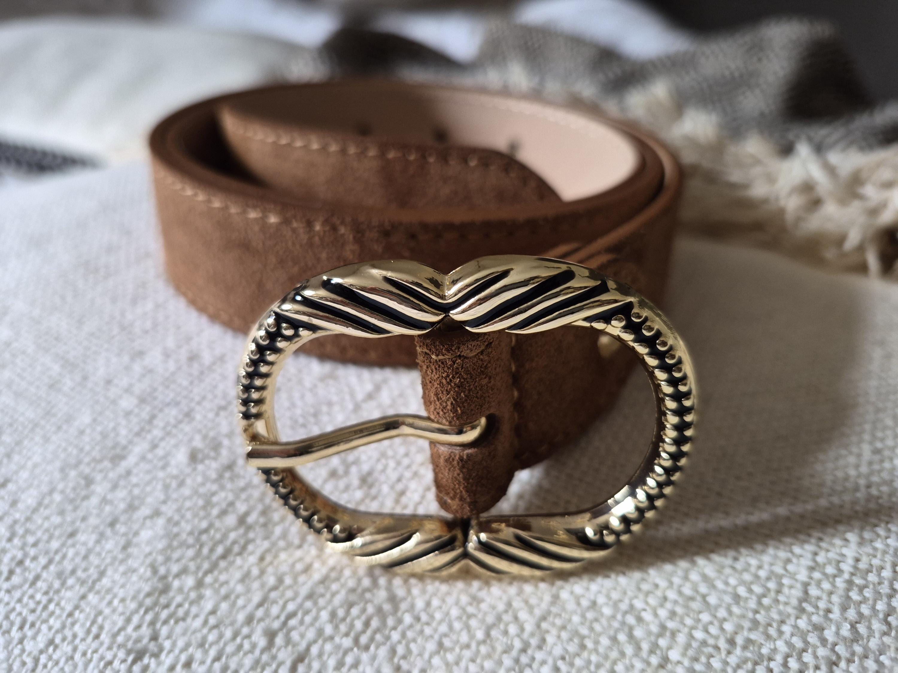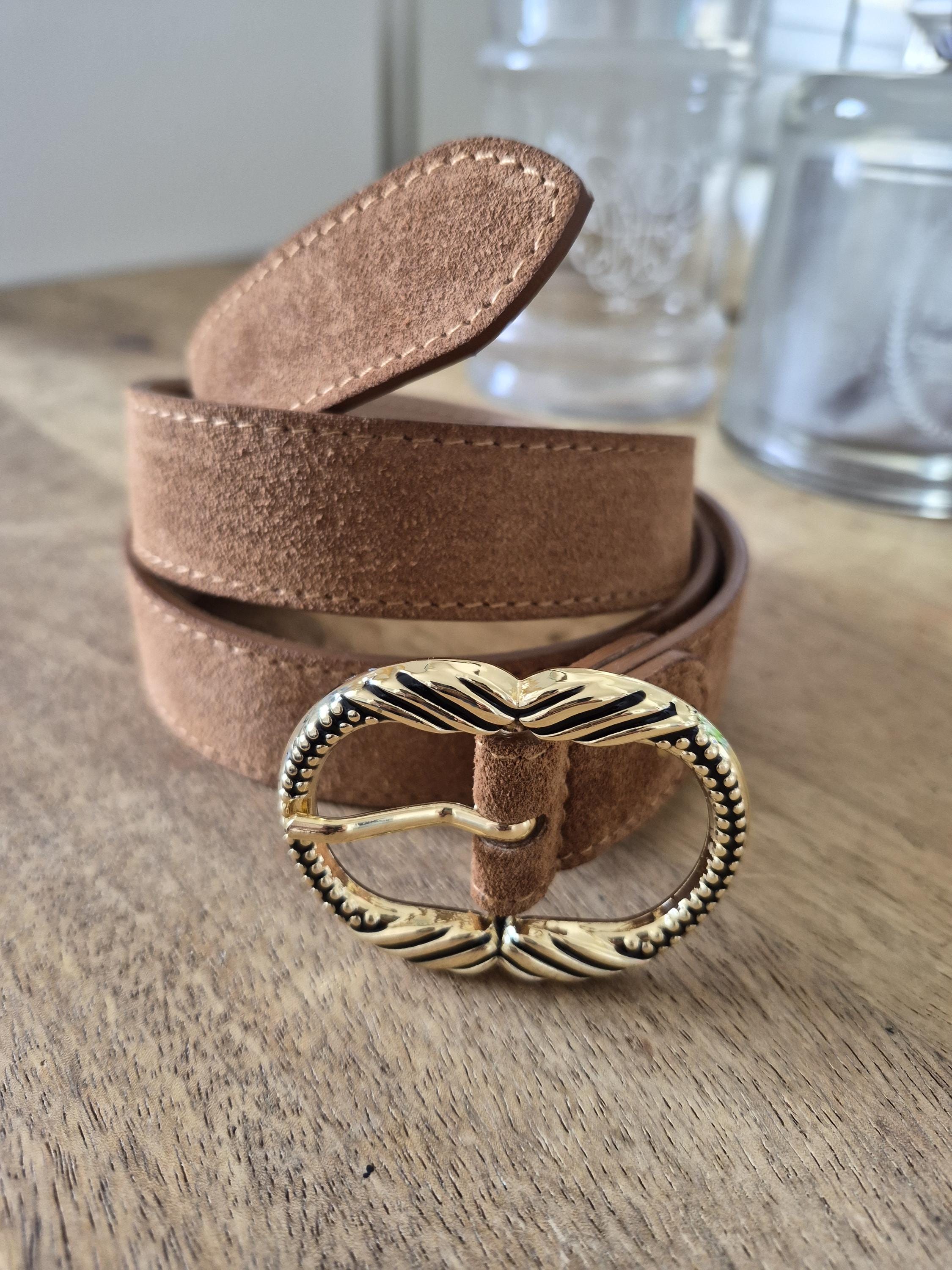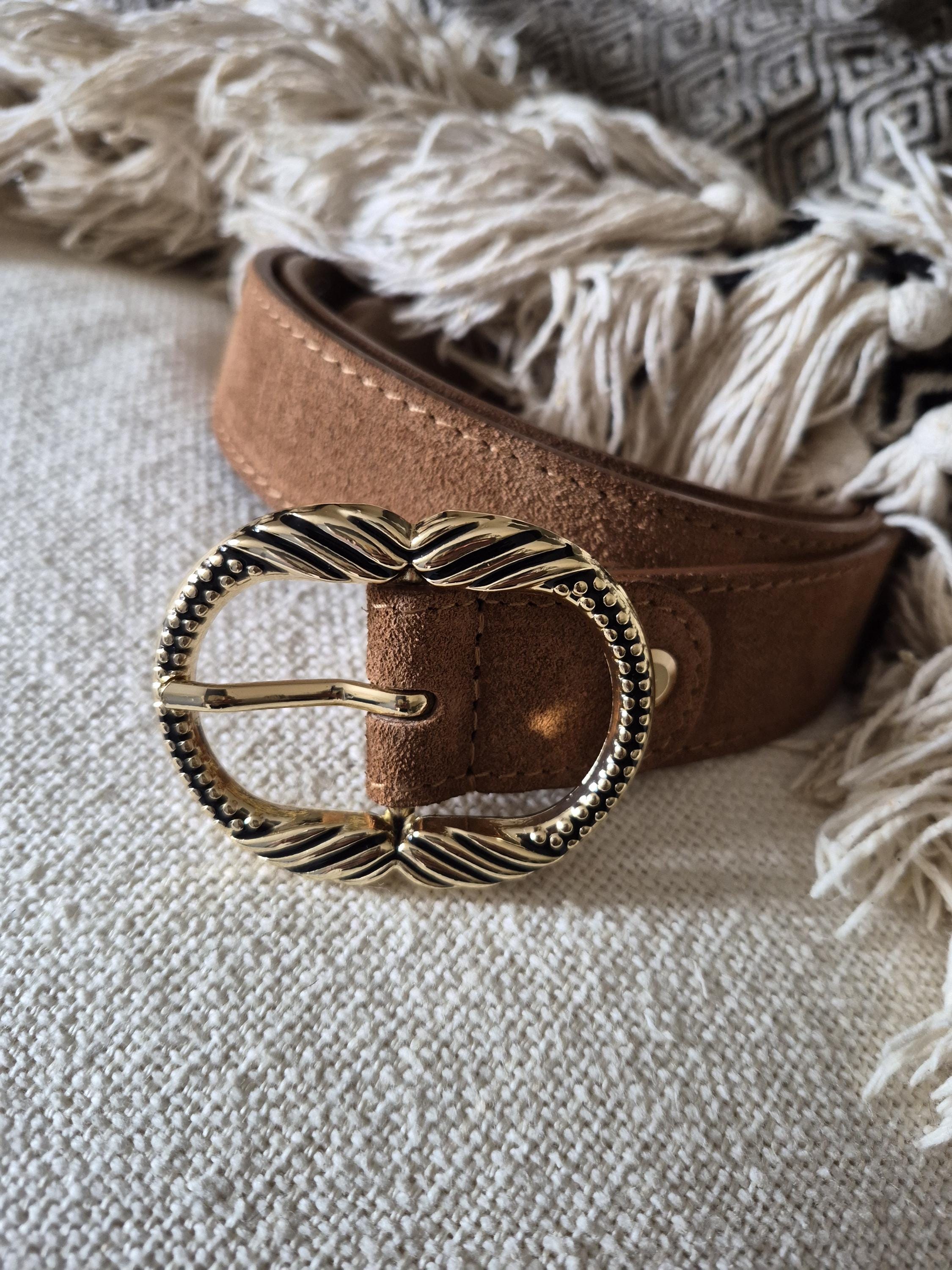 Add a touch of boho chic to your outfits with this stunning camel suede leather belt, adorned with a finely crafted oval gold buckle. Its elegant yet trendy style makes it the perfect accessory to structure a dress, cinch a blazer, or complement high-waisted jeans.
