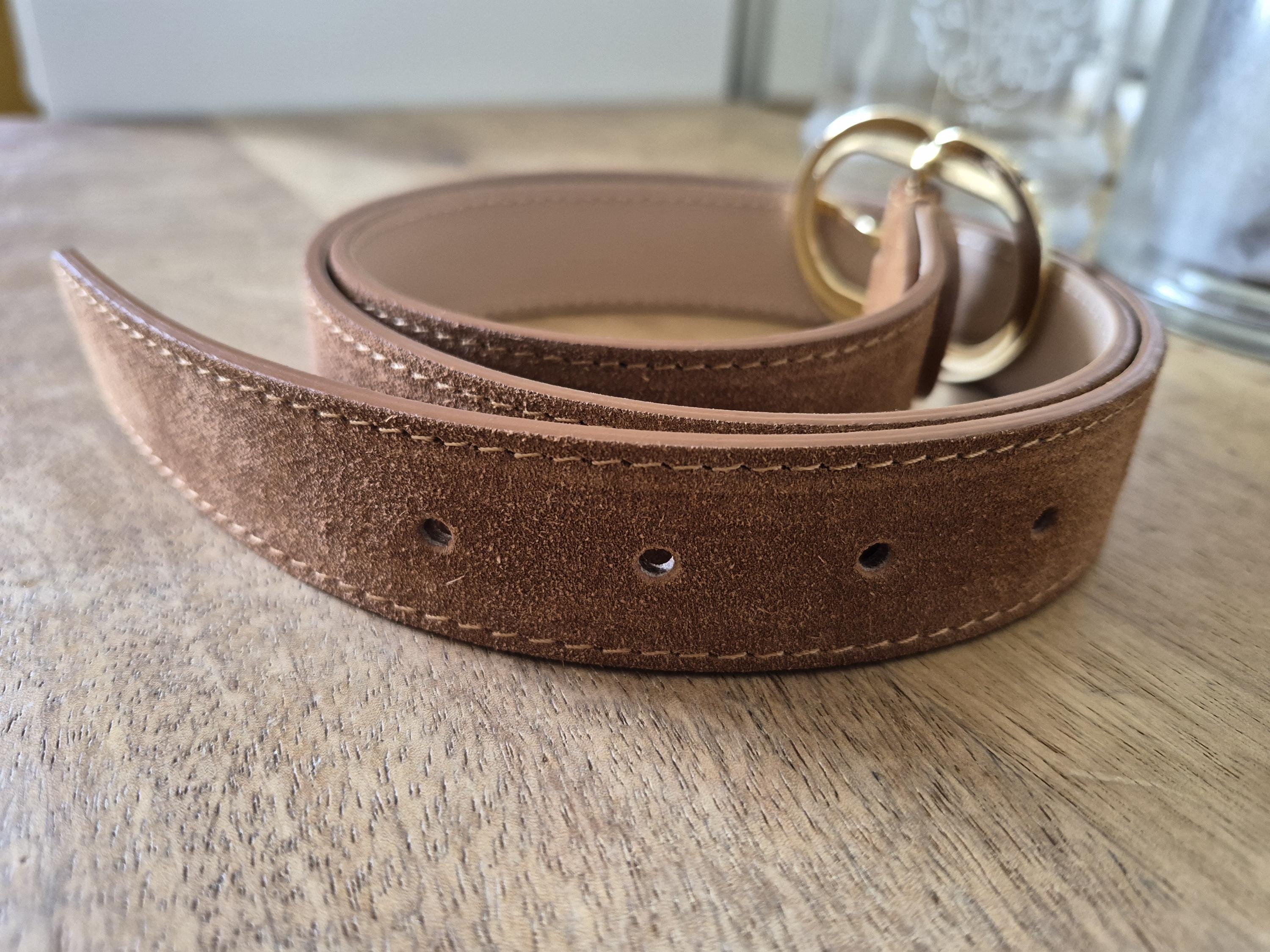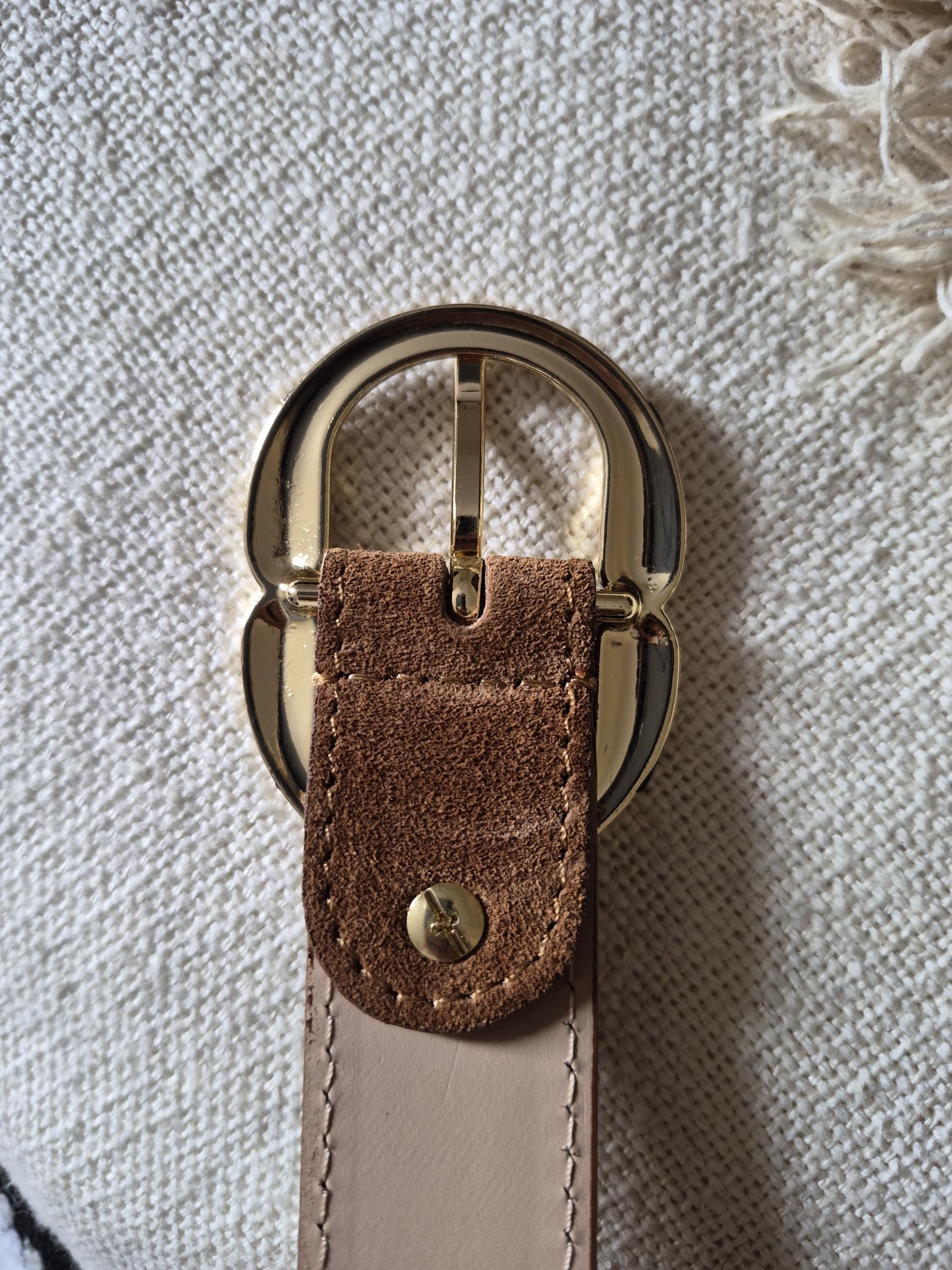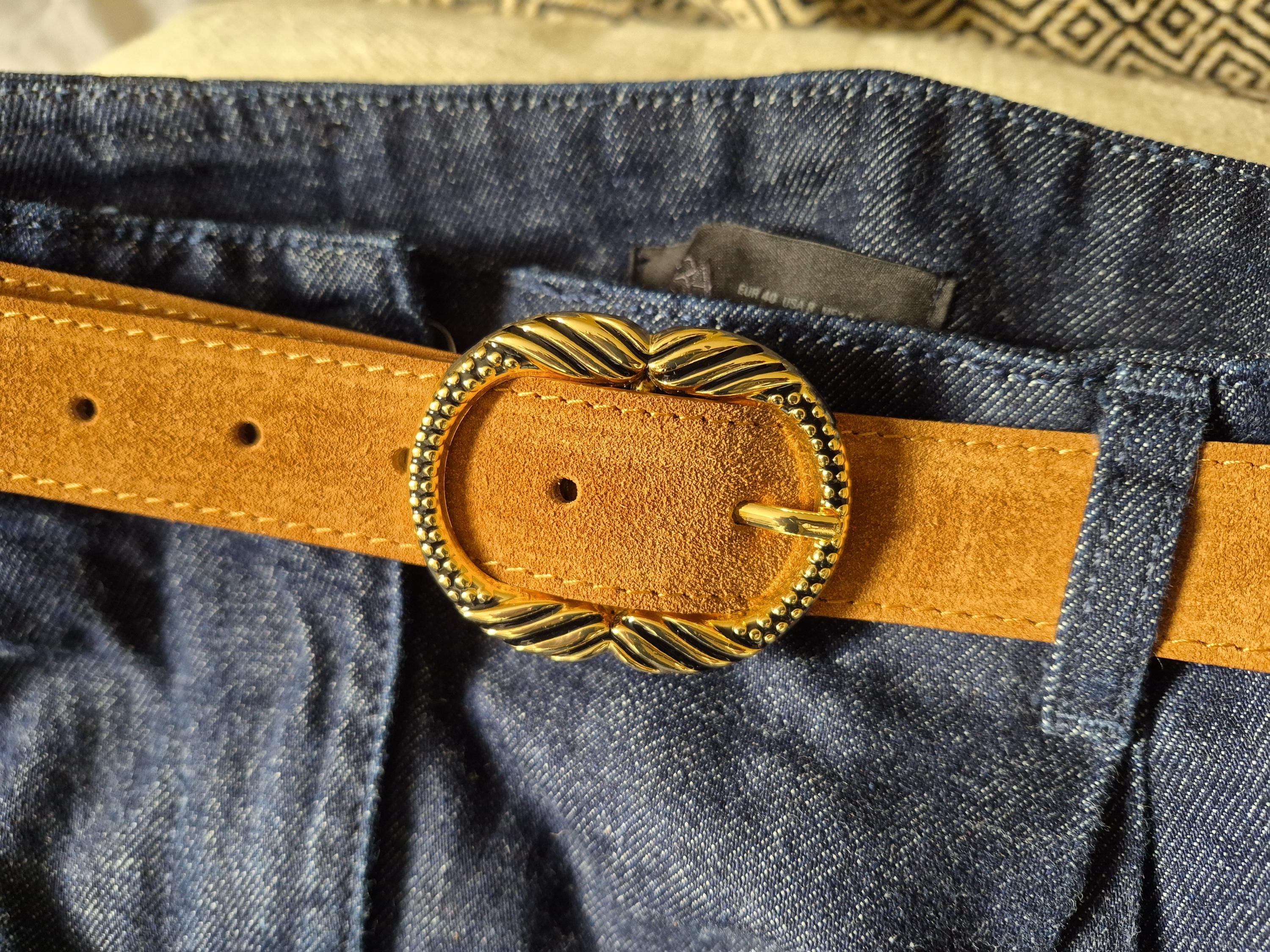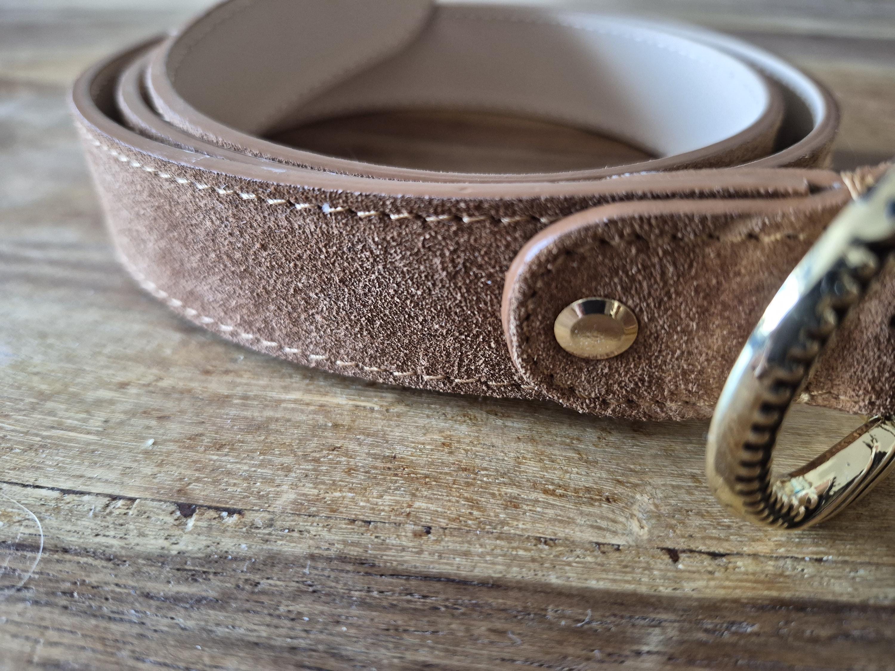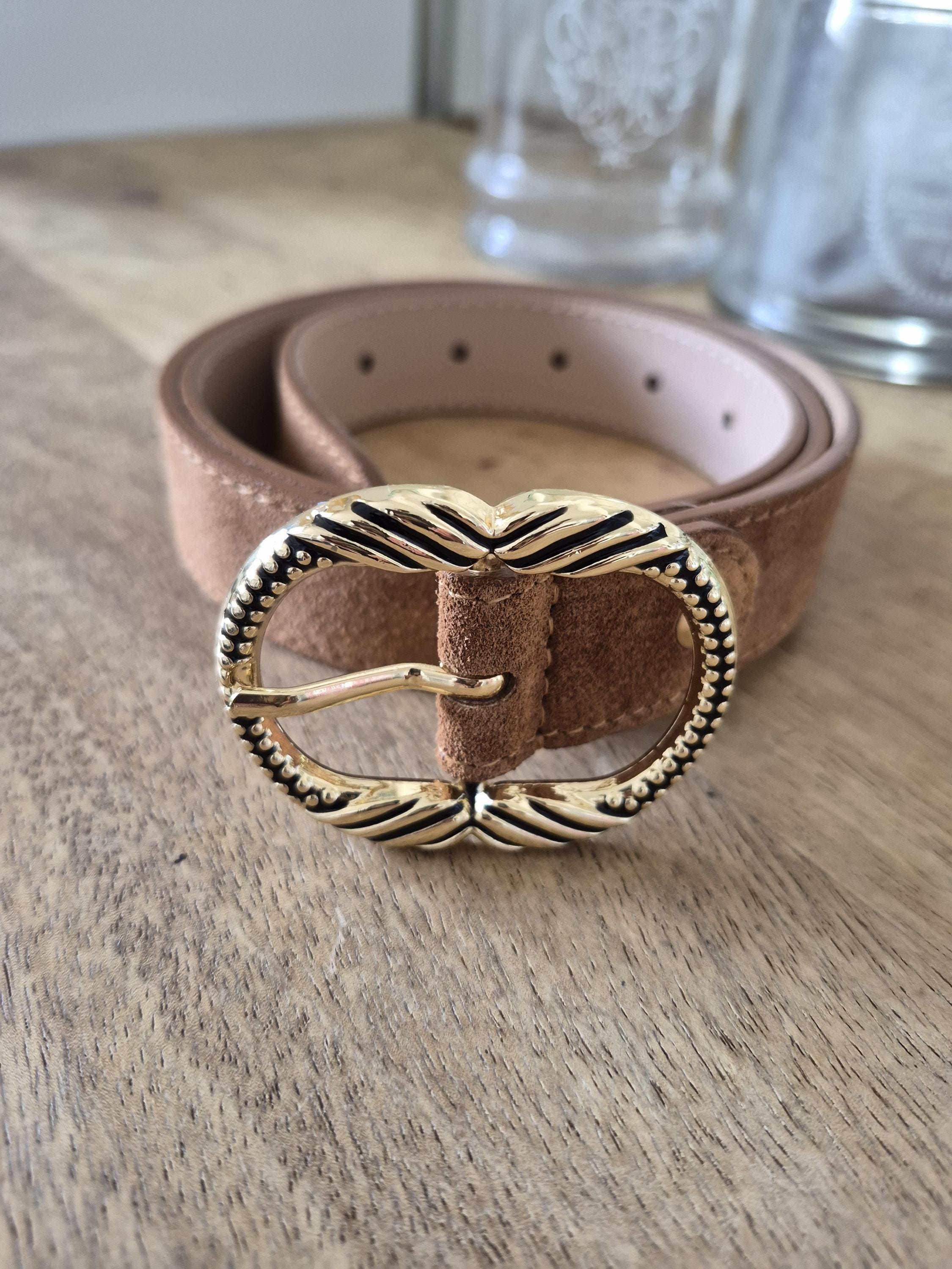 Add a touch of boho chic to your outfits with this stunning camel suede leather belt, adorned with a finely crafted oval gold buckle. Its elegant yet trendy style makes it the perfect accessory to structure a dress, cinch a blazer, or complement high-waisted jeans.